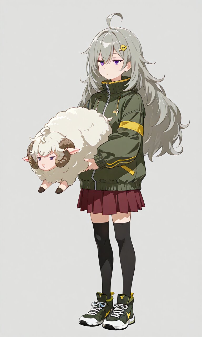 1 girl, (holding sheep, higatsutsuji-default,purple eyes,jitome,grey hair, long hair,ahoge,hair ornament,green jacket,red skirt,black thighhighs, sneakers