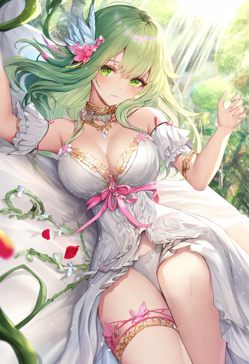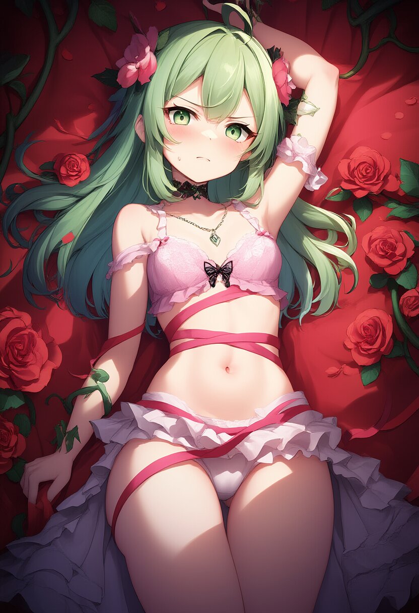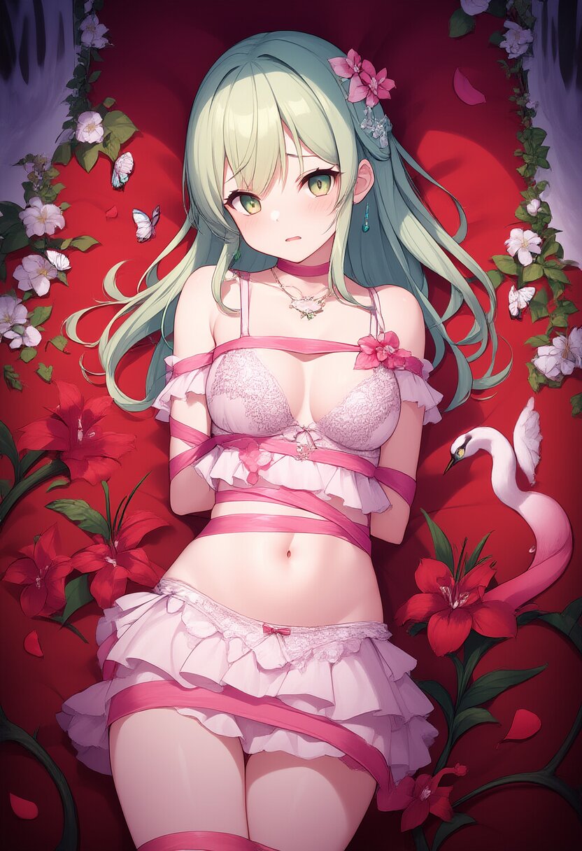 Picture the beautiful 18-year-old Alraune, her beautifully detailed red flowers and vines, waterfalls, petals, and butterflies. A girl with outstanding femininity, she has detailed pale green hair and green eyes that are quietly beautiful on her own. Hair ornaments, chokers, ribbons, and necklaces add flair to her look, while beautifully detailed camisoles, bras, and underwear are drenched. Many cranes wrap around the body, and there are cranes dancing in the air. The dress has ruffled trim and ruffled sleeves. At the same time, a girl lying on the bed. She is tied up with a pink ribbon and has a slightly troubled expression on her face. There is a ribbon on the bed and her shame is in the air..official art, {{ultra-detailed}}, {{high resolution}}, dynamic fuzziness, colorful, cowboy shot, underwear, girl ,solo, 20 years old, beautiful detailed hair, beautiful detailed eyes, hypermaximalist, super detailed, , no text, best quality, very aesthetic, absurdres