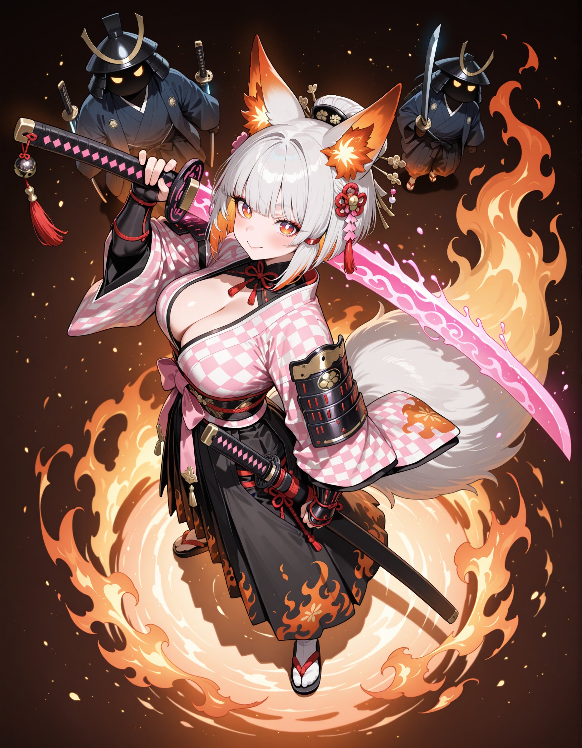 super fine concept art, hard surface, 8K, masterpiece, best quality, amazing quality, very aesthetic, absurdres, from side, looking at viewer, (fisheye,fisheye lens angle:1.0), from above, looking up looking at viewer, (dutch angle:1.2), The silhouette is composed of dynamic, gingham and vibrant rectangle. The background is a solid, creating a striking contrast with the intricate, multi-colored design of the character, summer atmosphere. 1girl, samurai, (muscular female:0.65), silver hair, amber colored inner hair, short hair, nihongami,Bowl cut , hair tubes, pink pupils, beautiful amber eyes long cleavage very long breasts, ,, (holding Japanese hotpink sword:1.3), scabbard, (hotpink samurai armor, kusazuri,dou,kote:0.8), kanzashi, sakuramon, sandals fox ears, fox tail, tabi, blush, smile, , greatsword, sword over shoulder (swirling ink effects:1.2) chasing, The background is a solid, bright burnt sienna, creating a striking contrast with the intricate, multi-colored design of the character, (dancing silhouette:0.0), pop color background, (high saturation:1.2), summer coloring, partly black ink wash effect, professional art lots of details, , overexposure, sumie effect style, 4ur4_illu,shiny, glowing, glowing particles, glowing light particles, light particles, flame burnt sienna, <lora:noline (1):-0.5> <lora:sdxl2-flat2-512b:0.0> <lora:facelightup_xl_v10:0.5> <lora:V2_yakumo_alchemy:0.5> <lora:Aura_illu:0.1>