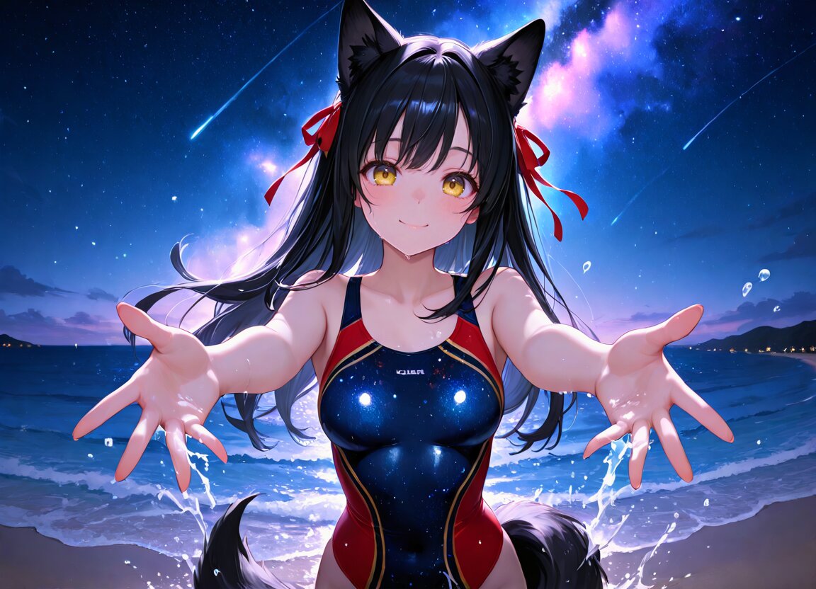 beach,in the ocean,with a water,night,splashing,starry sky, 1girl,solo,<澪>, painted one-piece swimsuit,starry sky painted, standing,smile, upper body,reaching towards viewer,, appropriate posture,appropriate configuration,ideal ratio body proportions,perfect anatomy, <lora:Fixhands_anime_bdsqlsz_V1:1>, masterpiece,best quality,newest,absurdres,highres,ultra high res,8K UHD,hyper-detailed,