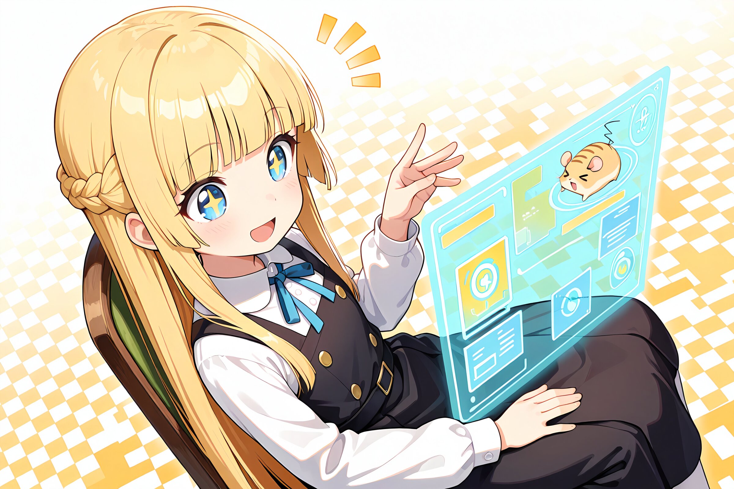 1 little girl, solo, diagonal angle, masterpiece, best quality, amazing quality, very aesthetic, (13yo:1.1), very long hair, blonde hair, french braid, straight hair, (hime cut:1.1), blunt bangs, blue eyes, black Pinafore dress, neck ribbon, white blouse, 4gold buttons, +_+, smile, cheerful, open mouth, +++, notice lines, holographic interface, sitting on chair, hamsters, > <, gold colored checkered background,