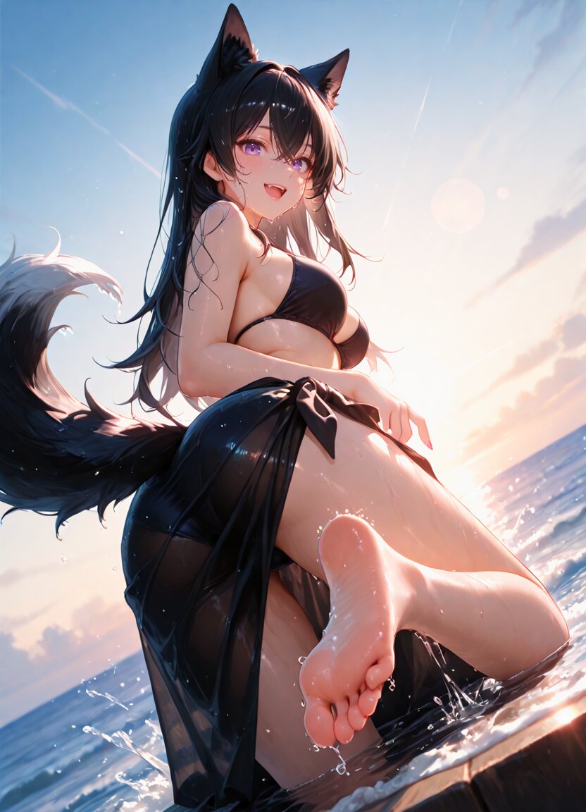 at ocean,day,splashing,lighting behind,highly detailed light reflection,lens flare, 1girl,20yo,<玲さん>, standing on one leg,sole of foot,:d,swimsuit,bikini,sarong, from behind,from below,dutch angle,cowboy shot, looking at viewer,(foot focus:1.2),wet,wet hair, Particles of light,complex,Natural Light,Attention to detail,Movie Scenes,<lora:Expressive_H-000001:0.8>,Expressiveh,<lora:flat_sdxl:-0.4>,<lora:outline_xl_kohaku_delta_spv5x:-0.4>,<lora:Detailer_NoobAI_Incrs_v1:0.8>,detailed,, appropriate posture,appropriate configuration,ideal ratio body proportions,perfect anatomy, <lora:Fixhands_anime_bdsqlsz_V1:1>, masterpiece,best quality,newest,absurdres,highres,ultra high res,8K UHD,hyper-detailed,