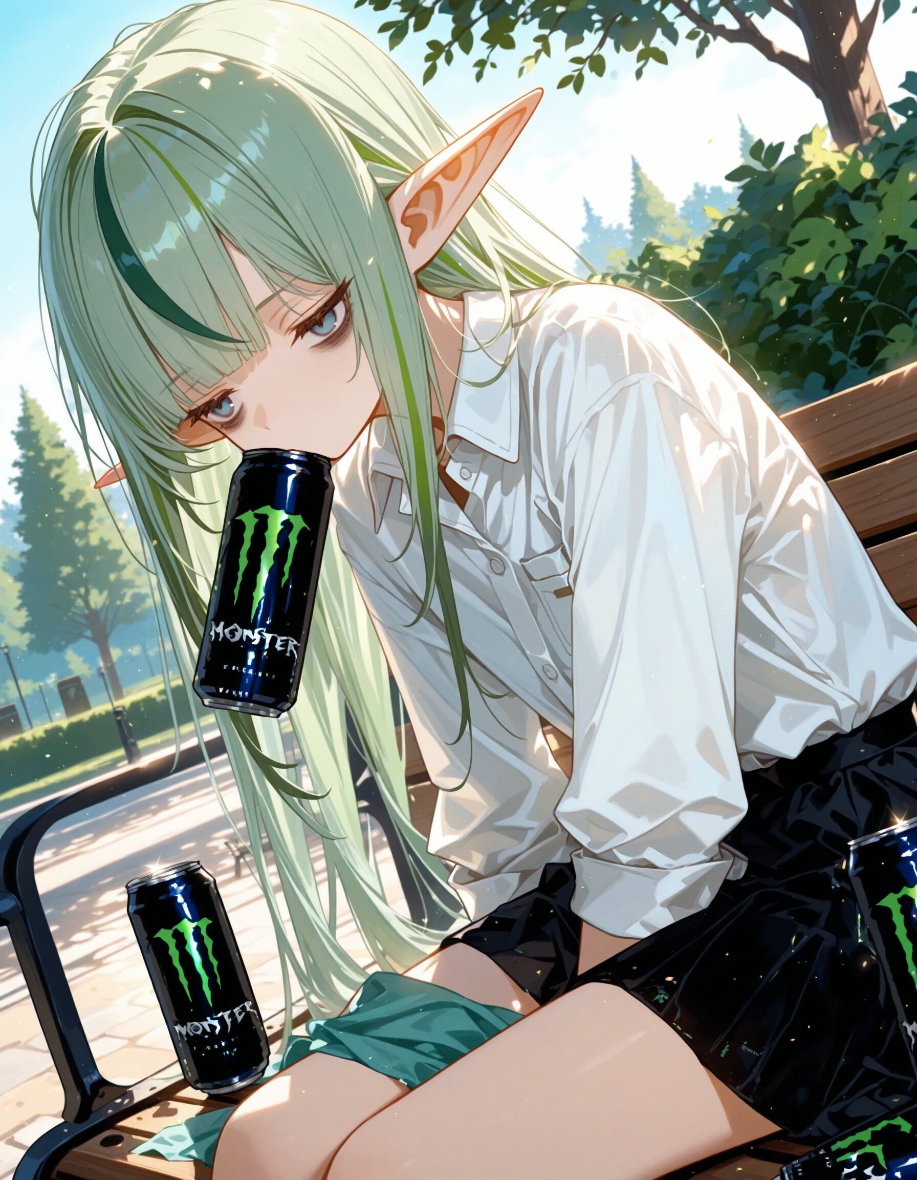 morning,sunny day,park,1girl,solo,sitting on bench,dutch angle,leaning forward,(elf),pastel green hair,(highlights hair,dark green streaked hair),straight long hair,hime cut hair,pointed ears,jitome,bags under eyes,(pure white collared shirt),messy cloth,flat chest,no tie,(black skirt),(drinking a monster energy can),((masterpiece, best quality, extremely detailed, absurdres)),