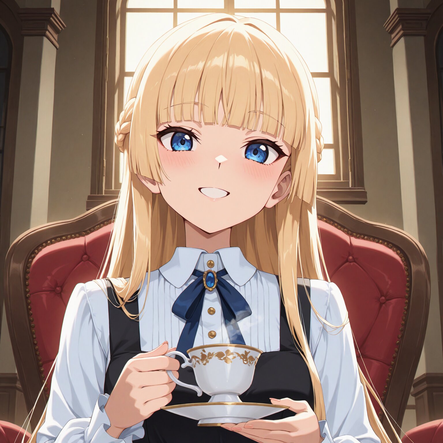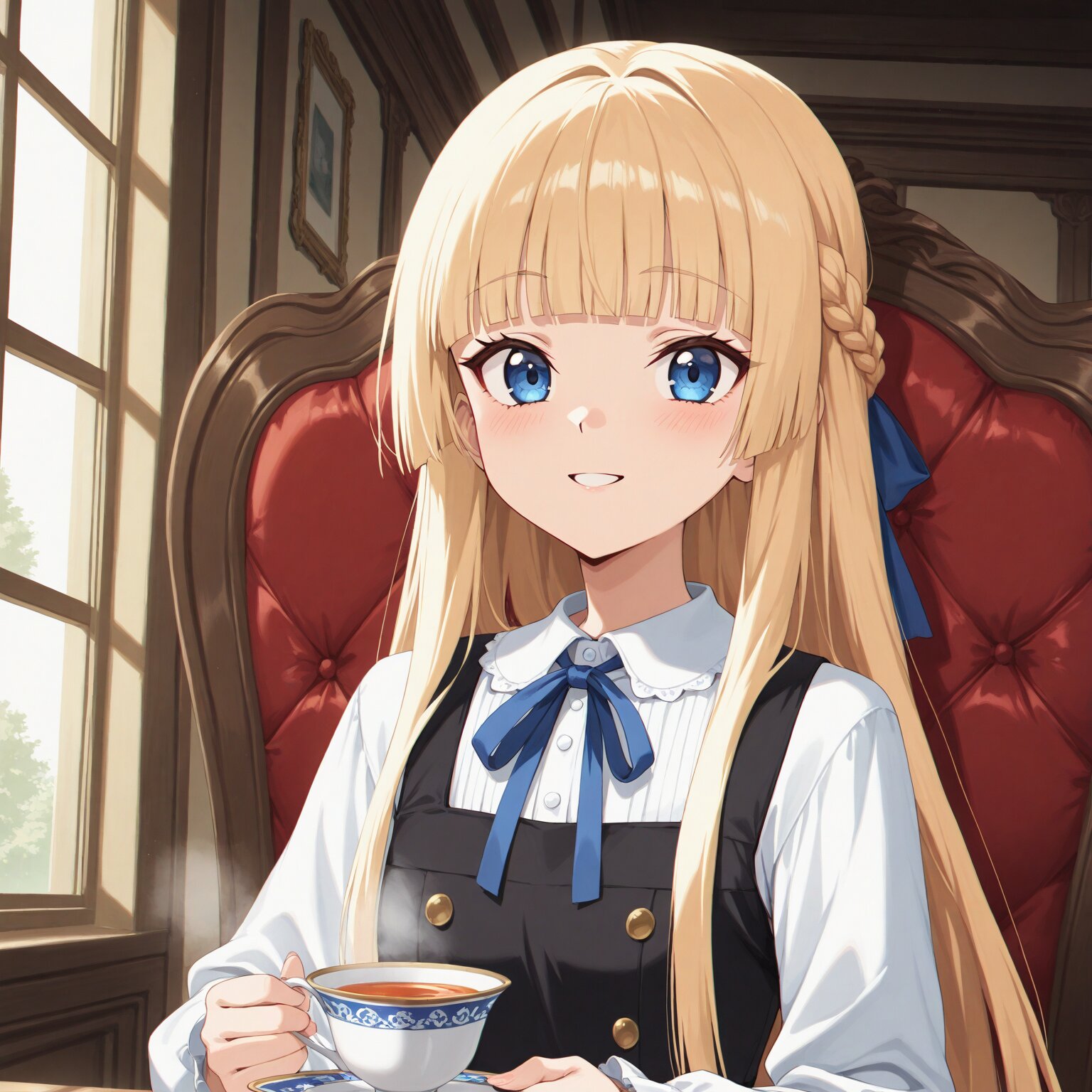 1girl, (13 years old, child:1.2), very long hair, blonde hair, french braid, straight hair, (hime cut:1.1), blunt bangs, blue eyes, black Pinafore dress, neck ribbon, white blouse, 4gold buttons, elegant, smiling, light streaming in through window holding tea, steam coming out luxury mansion, guest room, luxurious chair, sitting in chair BREAK, ((newest, year 2024, anime, animation, anime screen capture, anime style:1.5)) BREAK, ((masterpiece, , vibrant, very aesthetic, highly detailed, best quality, 16k:1.5)) Perfect hands, perfect fingers,