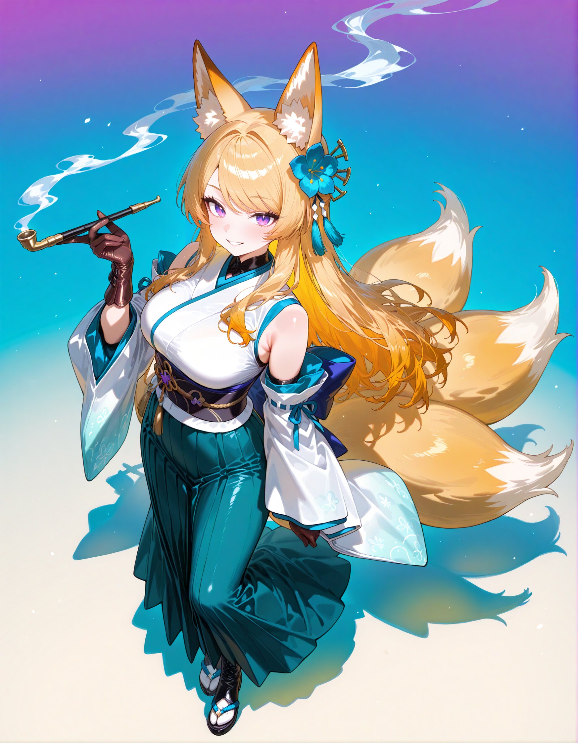 from side (portrait:1.0) from above, looking up , looking at viewer, (simple watercolor background:1.1), drop shadow, colored shadow, The background is a solid, bright cobalt green, creating a striking contrast with the intricate, multi-colored design of the character, pop color background, (high saturation:1.2), summer coloring, 1girl, fox girl, gold Blond Hair, large breasts and fox ears, (swept bangs:1.2), (perfect purple eyes:1.3) long eyelashes aristocratic features tall girl has (Blond Hair long hair over ears:1.3) fox 9tails, (wearing White Japanese Cloth straw sandal leather gloves long skirt Obi boots:1.3), hair ornament flower, tabi, detached sleeves, mysterious atmosphere, seductive smile, holding smoke pipe light smoke breath, super fine concept art, 8K, graceful eyes, masterpiece, best quality, amazing quality, very aesthetic, absurdres, newest, professional art lots of details, , overexposure, shiny-glistening, (watercolor style:1.0), (pastel color style:0.0) <lora:noline (1):0.5> <lora:sdxl2-flat2-512b:-0.5> <lora:facelightup_xl_v10:0.5>