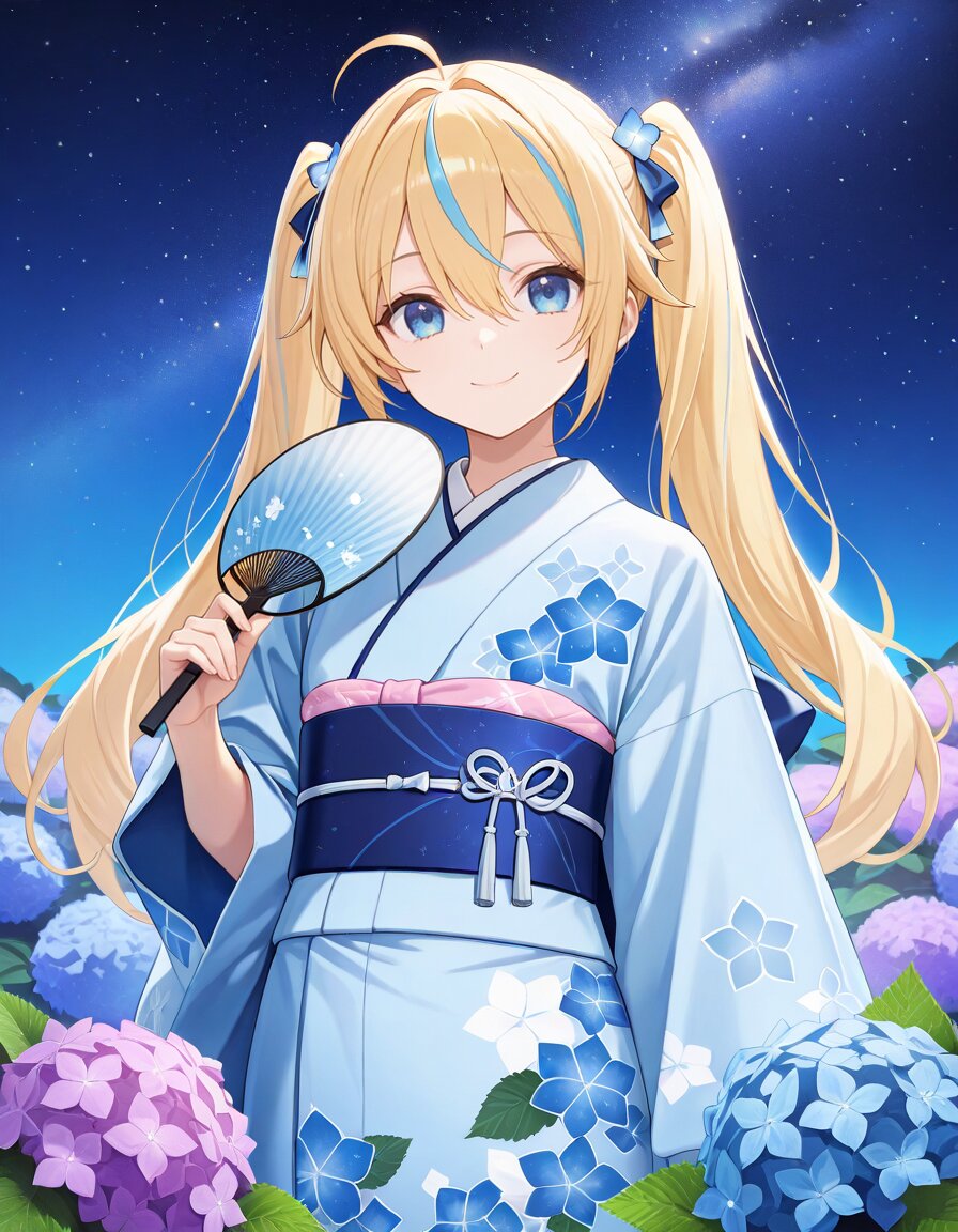 masterpiece,best quality,highres,highly detailed,general,starry sky,night,holding japanese fan,1girl,solo,twintails,long hair,blue eyes,blonde hair,blue streaked hair,ahoge,bangs between eyes,smile,long blue japanese clothes,hydrangea patterned japanese clothes,obi,hydrangea background,