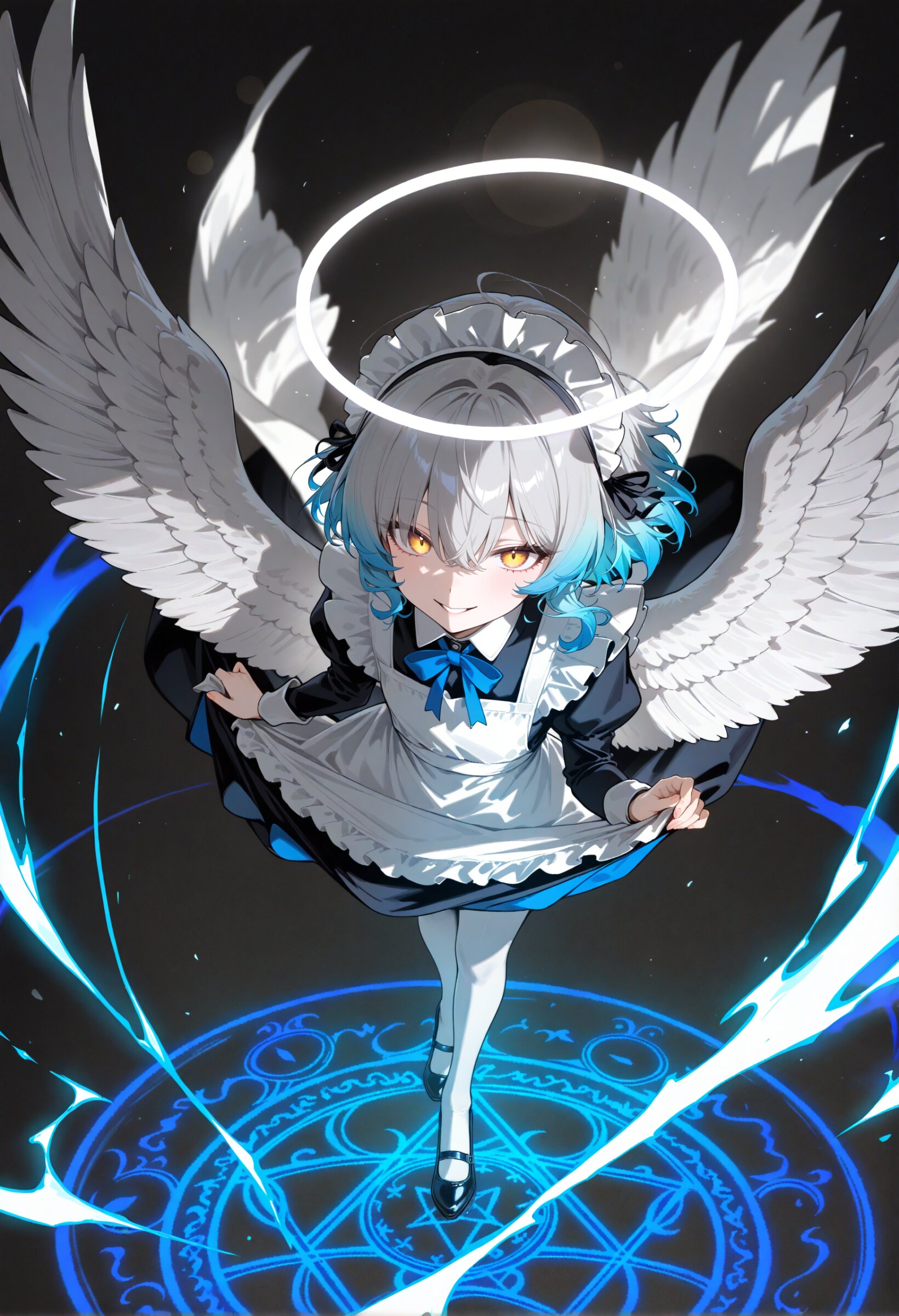 close to viewer (from above,looking up:1.2) (absurdres absolutely resolution:1.2),texture, official art, ultra detailed, unity 8k wallpaper, dark theme, paper background, sumi-e, faux traditional media, color ink \(medium\), painting \(medium\), calligraphy brush (medium), monochrome, spot color, 1girl, (ultra-detailed), solo, maid, pale skin, pale aquamarine hair, (beautiful slit pupils, naughty face:1.0), long sleeves classic maid uniform, long skirt, maid headdress, maid apron, luminous effect lens flare lotion shiny-glistening cute girl solo full body, standing, crossed legs, skirt lift, graceful courtesy, bowing (feathered wings, glowing halo:1.1), ink wash painting, (ultra detailed floating glowing magic circle:1.2), (high saturation) An illustration with line art drawn using a brush, featuring dynamic movement lines expressed with thick sumi ink strokes. super fine concept art, hard surface, 8K, unreal engine, masterpiece, best quality, amazing quality, very aesthetic, absurdres, you can add scenery, (volumetric lighting), To make the background more distinctive. professional art lots of details, , overexposure, sumie effect style, <lora:noline (1):0.5> <lora:sdxl2-flat2-512b:0.5> <lora:facelightup_xl_v10:0.5>