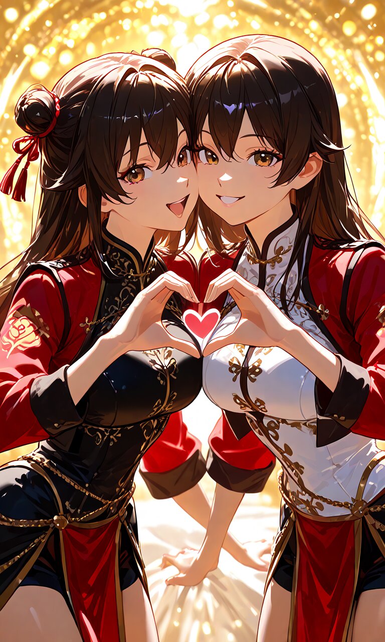 (2 persons, 2 girls), smile, cowboy shot,<lora:heart-hands-duo-ponyxl-lora-nochekaiser:1> heart hands duo, heart hands, heart, heads together, cheek-to-cheek, open mouth, smile, hetero