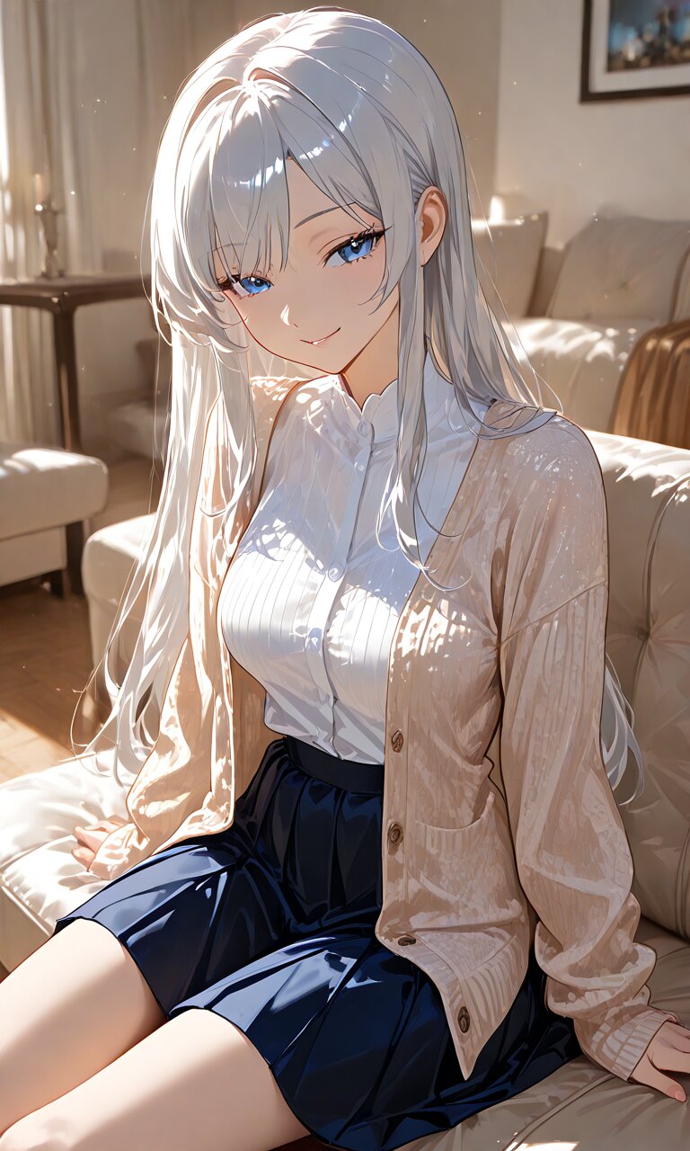 1 lady, blue eyes, long hair, silver hair, (see-through cardigan, white Tshirt), skirt, living room, seductive smile, relaxed, sitting, side view