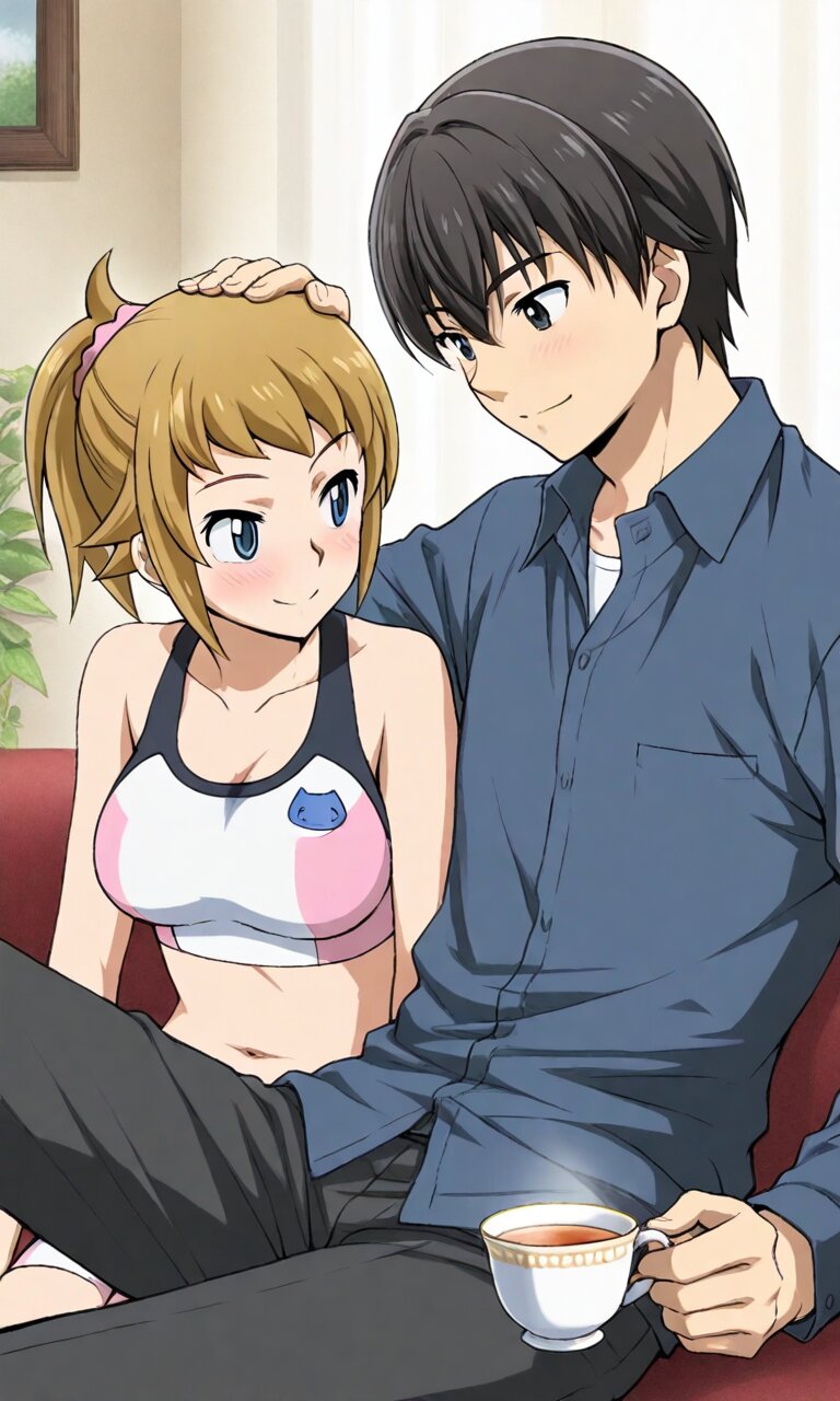 Couple, boy and girl, two people only,absurdres, ultra-detailed, master piece, high resolution, 8k, Boy, girl, couple,a man and woman sitting next to each other holding a cup of tea, 1girl, 1boy, cup, smile, teacup, holding, headpat, hand on another's head, ,navel BREAK the boy(original boy,black hair,short hair, black eyes) BREAK the girl(1girl, solo, hoshino fumina, brown hair, short hair, hair scrunchie, pink scrunchie, ponytail, blue eyes, large_breasts, ),