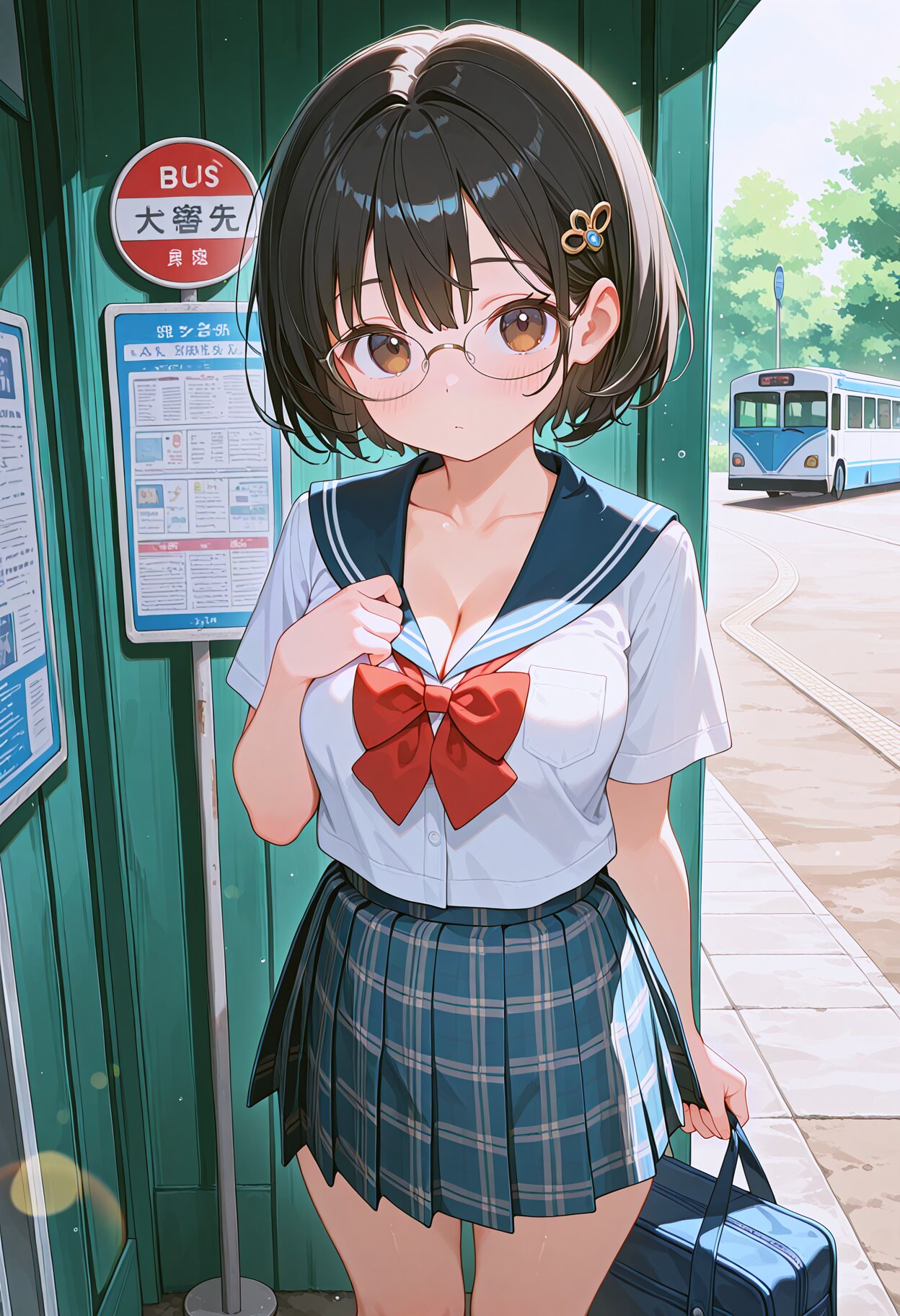 1girl, glasses, hair_ornament, school uniform, sailor collar, bow, short hair, black hair, brown eyes, blush, looking at viewer, cleavage, pleated skirt, plaid skirt, white sleeves, standing, holding bag, bus stop, sunlight, bokeh, summer