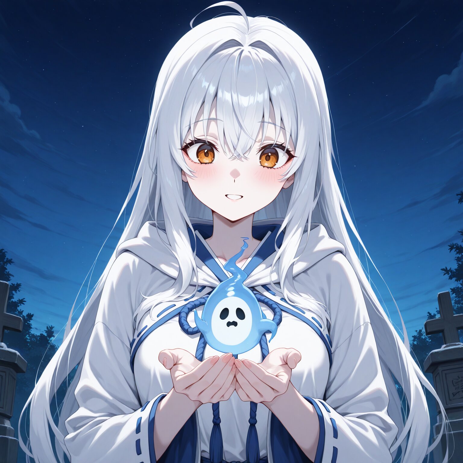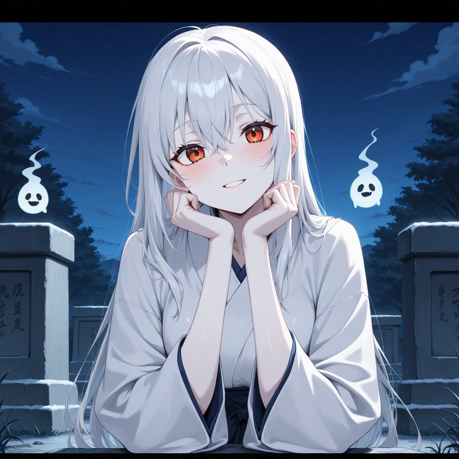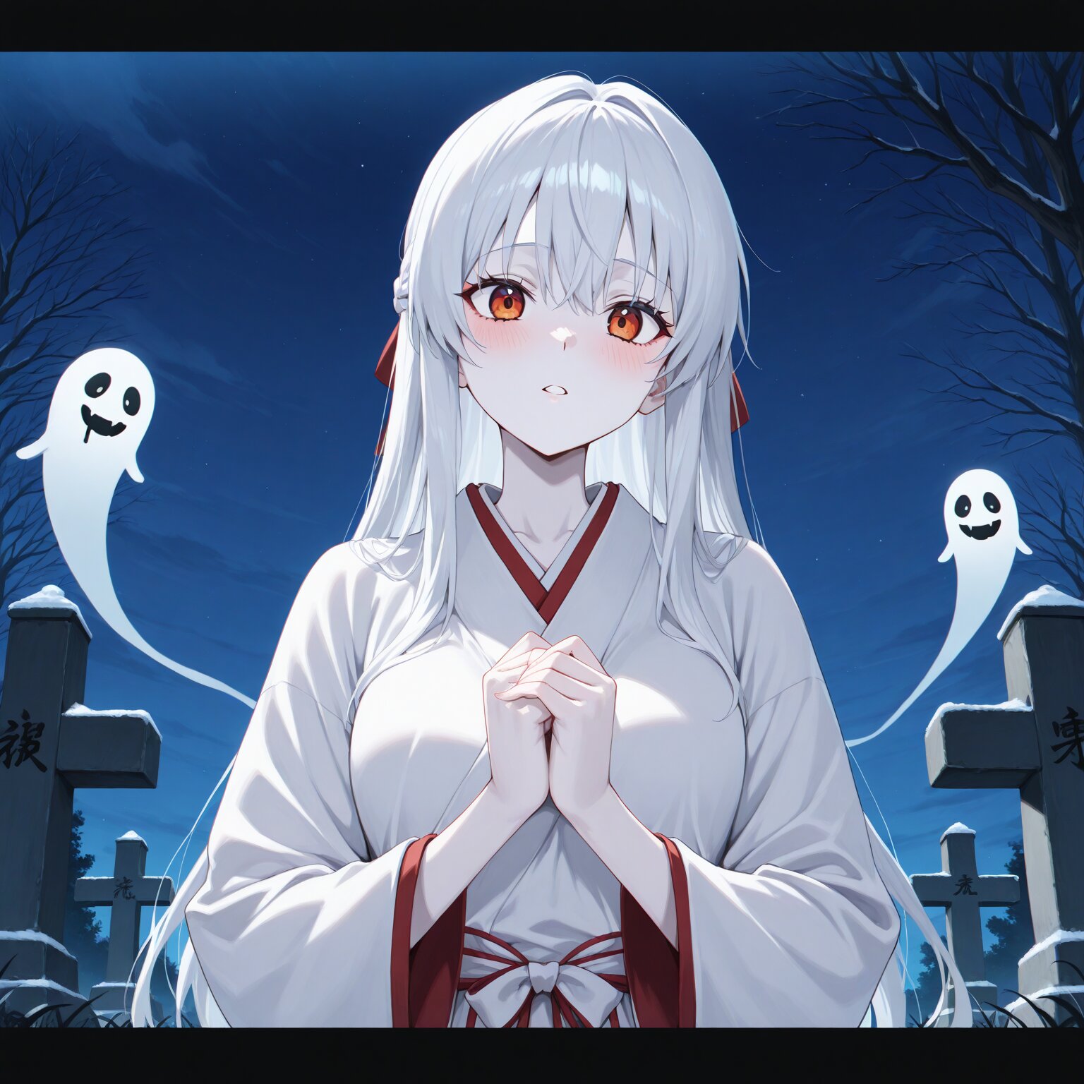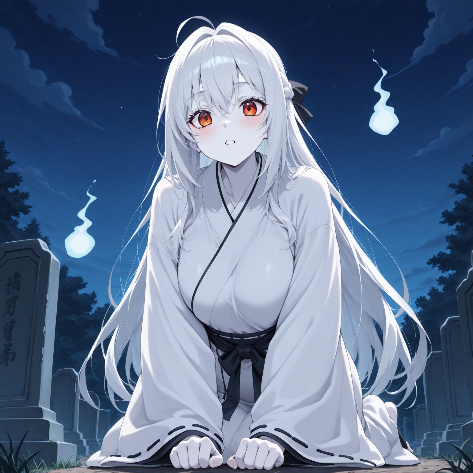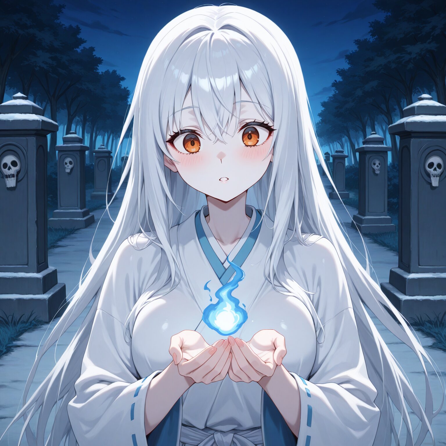 1woman, BREAK, White hair, long hair, white skin, pale, pure white, BREAK, Orange eyes BREAK, white robe, Long sleeves, BREAK, Ghosts around, ghost, creepy, horror, BREAK, Grave, night, BREAK, ((newest, year 2024, anime, animation, anime screen capture, anime style:1.5)) BREAK, ((masterpiece, , vibrant, very aesthetic, highly detailed, best quality, 16k:1.5)) Perfect hands, perfect fingers,