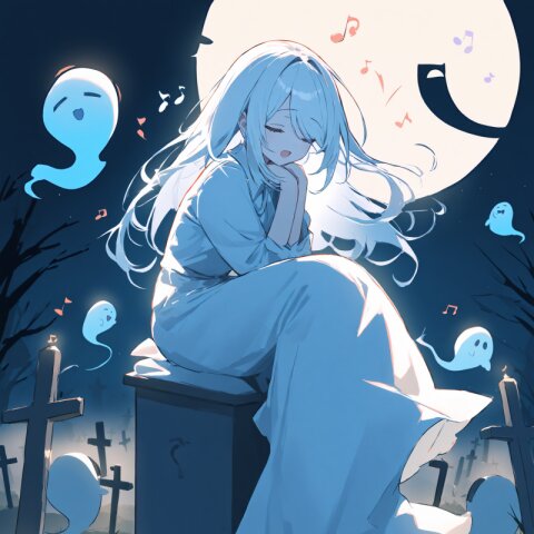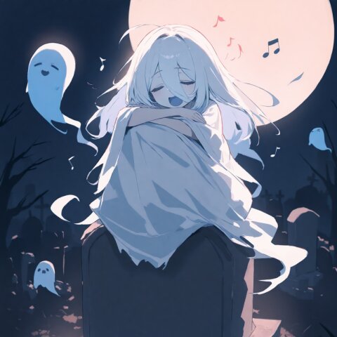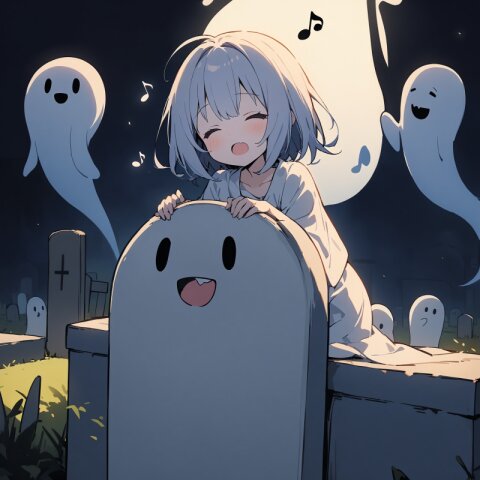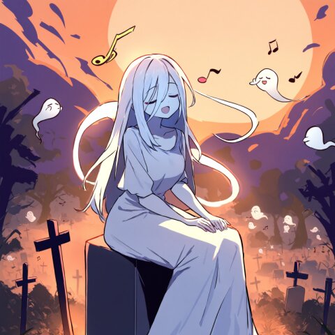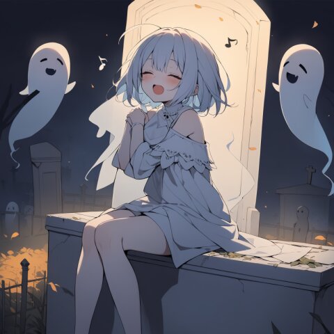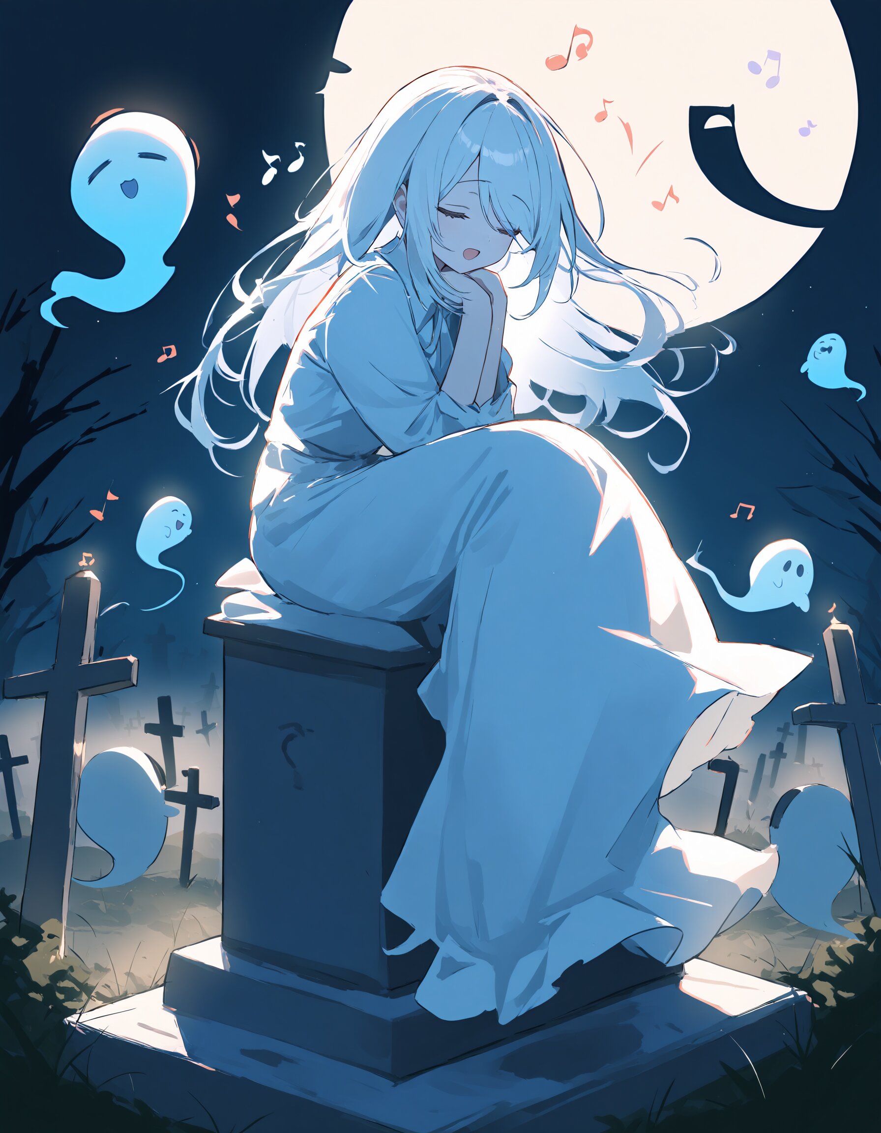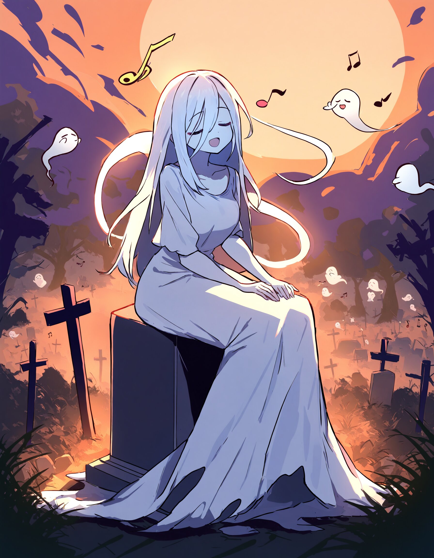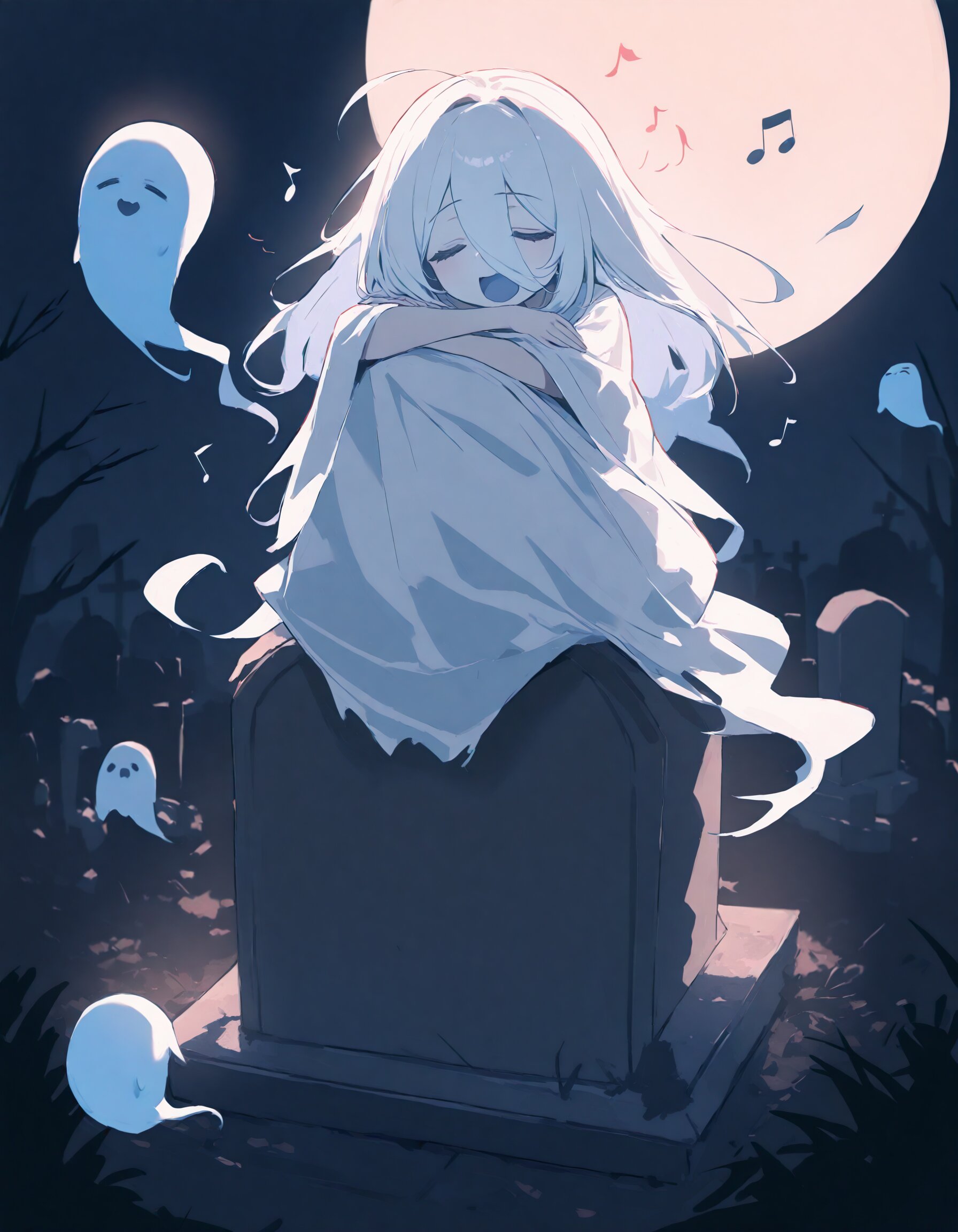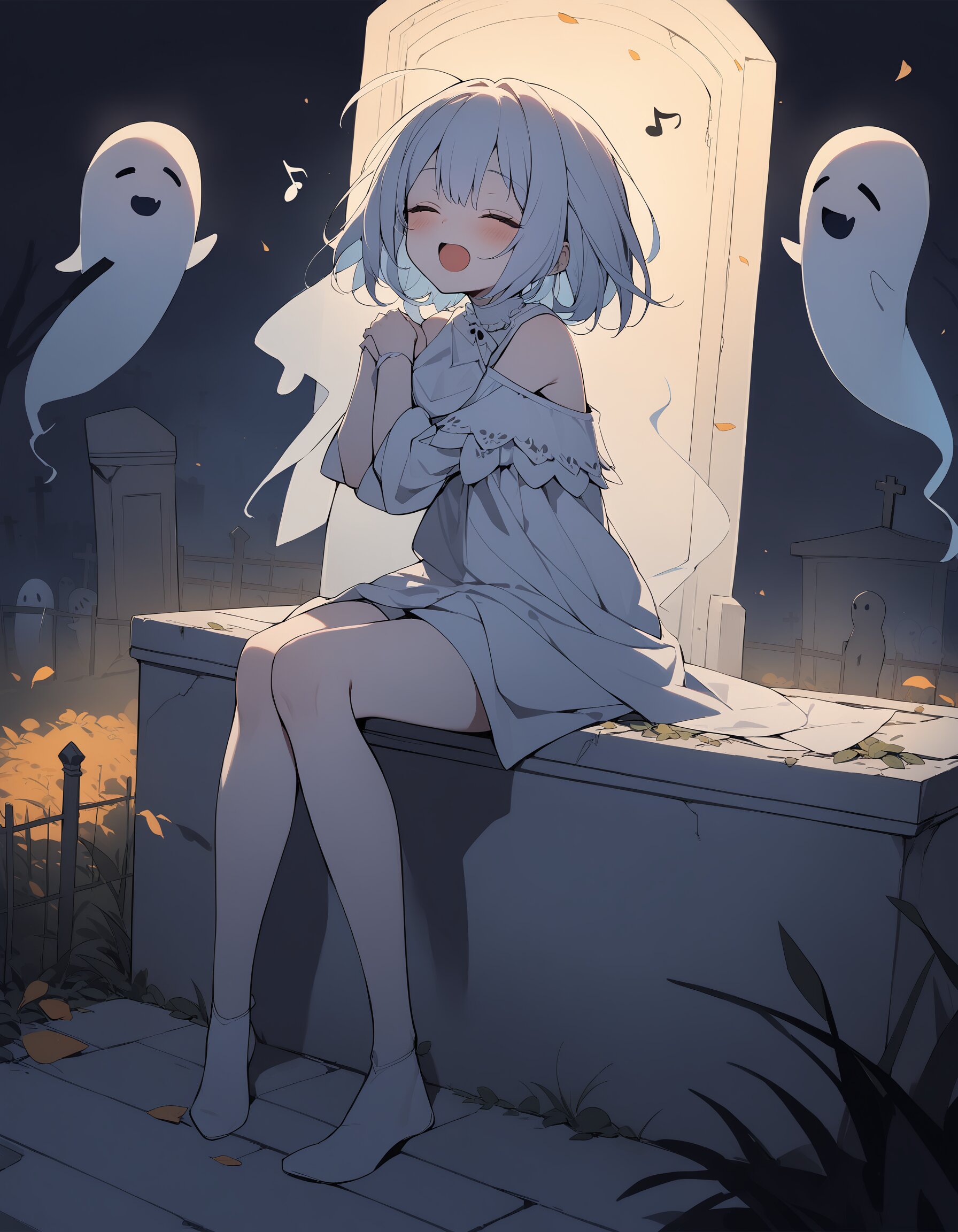 1girl, solo, ghost girl, cute ghost, graveyard, sitting on tombstone, at midnight, hands on tomb, closed eyes, open mouth, musical note, masterpiece, great score, high score, absurdres