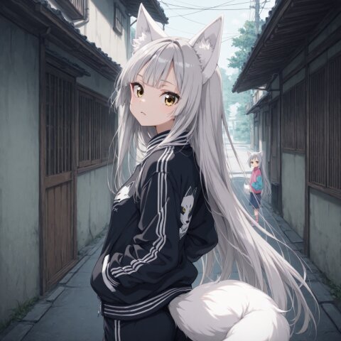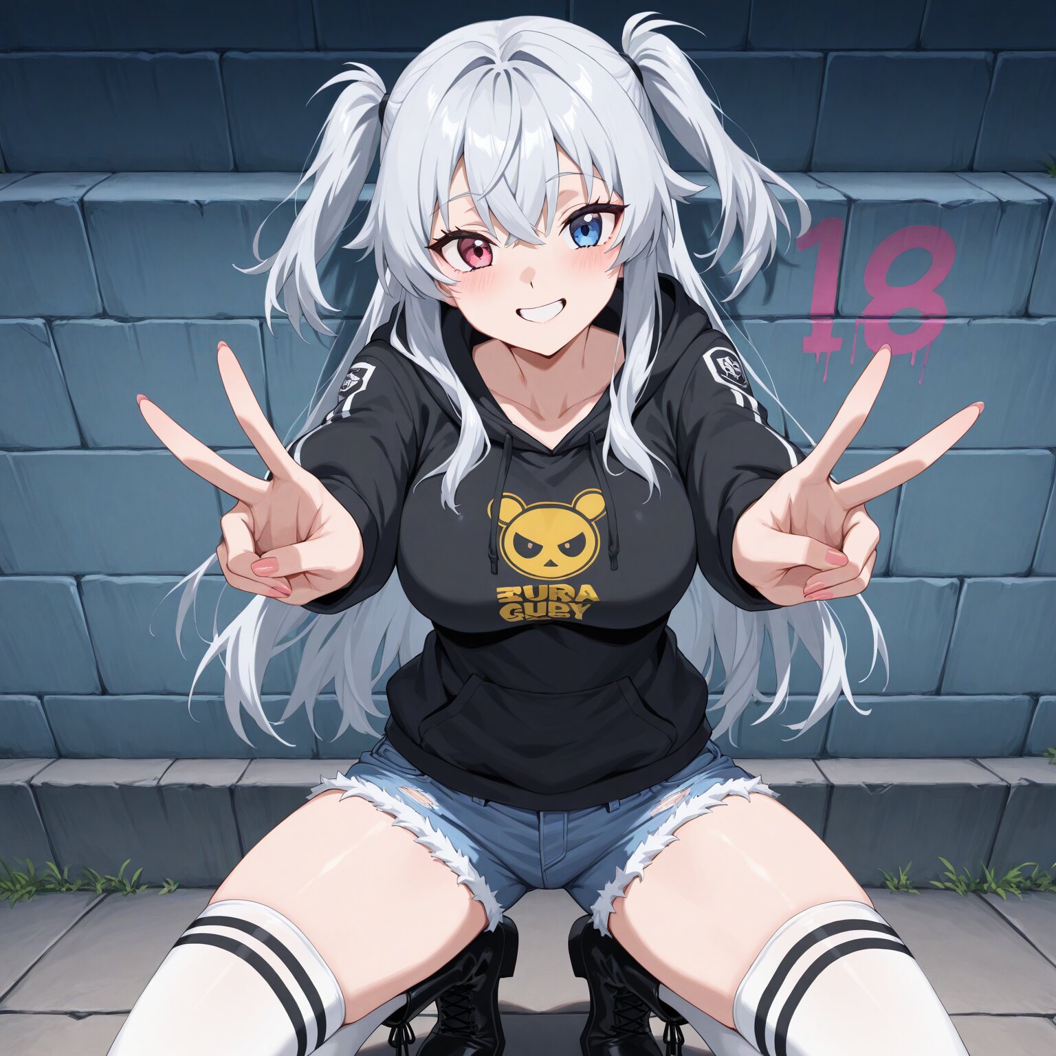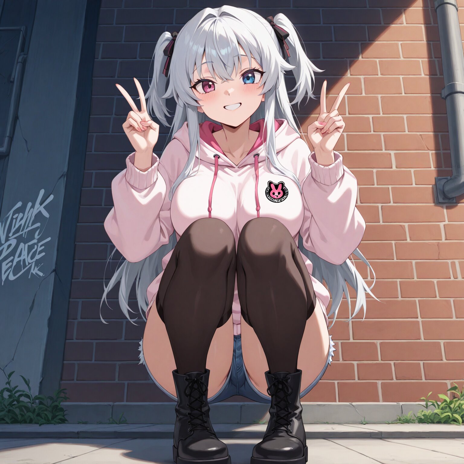 1woman, BREAK, medium large breasts,silver hair,long hair,two side up,pink eyes,blue eyes,heterochromia, Hoodie, hoodie with logo, shorts, denim, boots, knee-high socks, ((double v, smiling, Making a peace sign with both hands)) In the city, downtown, urban area, Wall with graffiti, brick wall crowd BREAK, ((newest, year 2024, anime, animation, anime screen capture, anime style:1.5)) BREAK, ((masterpiece, , vibrant, very aesthetic, highly detailed, best quality, 16k:1.5)) Perfect hands, perfect fingers,