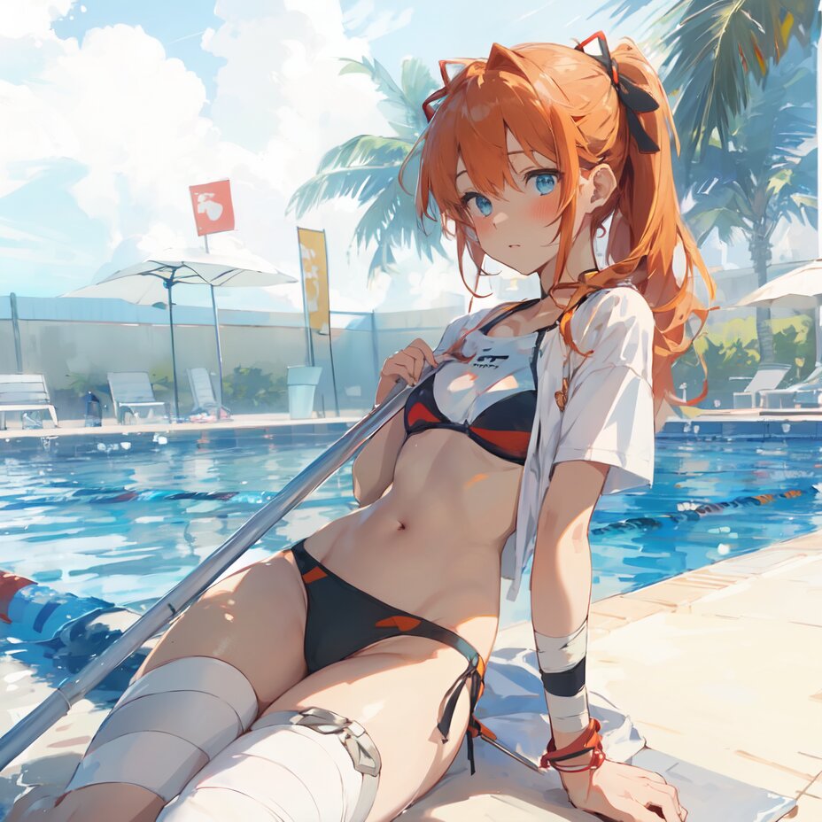 masterpiece, best quality, at poolside, How to hold 1crutch properly, 1girl,crutch, hopeless swimmer, bandage, bikini pants, Embarrassed, Blushing, panicking, bandage, bikini pants,1crutch, rest her crutch on her side, souryu_asuka_langley, [evangelion], t-shirt, a white short-sleeved t-shirt, swimming pants, thick thighs, absolute territory, orange hair, long hair, blue eyes, blue sky, in summer, shinning, close up of legs, View from below,