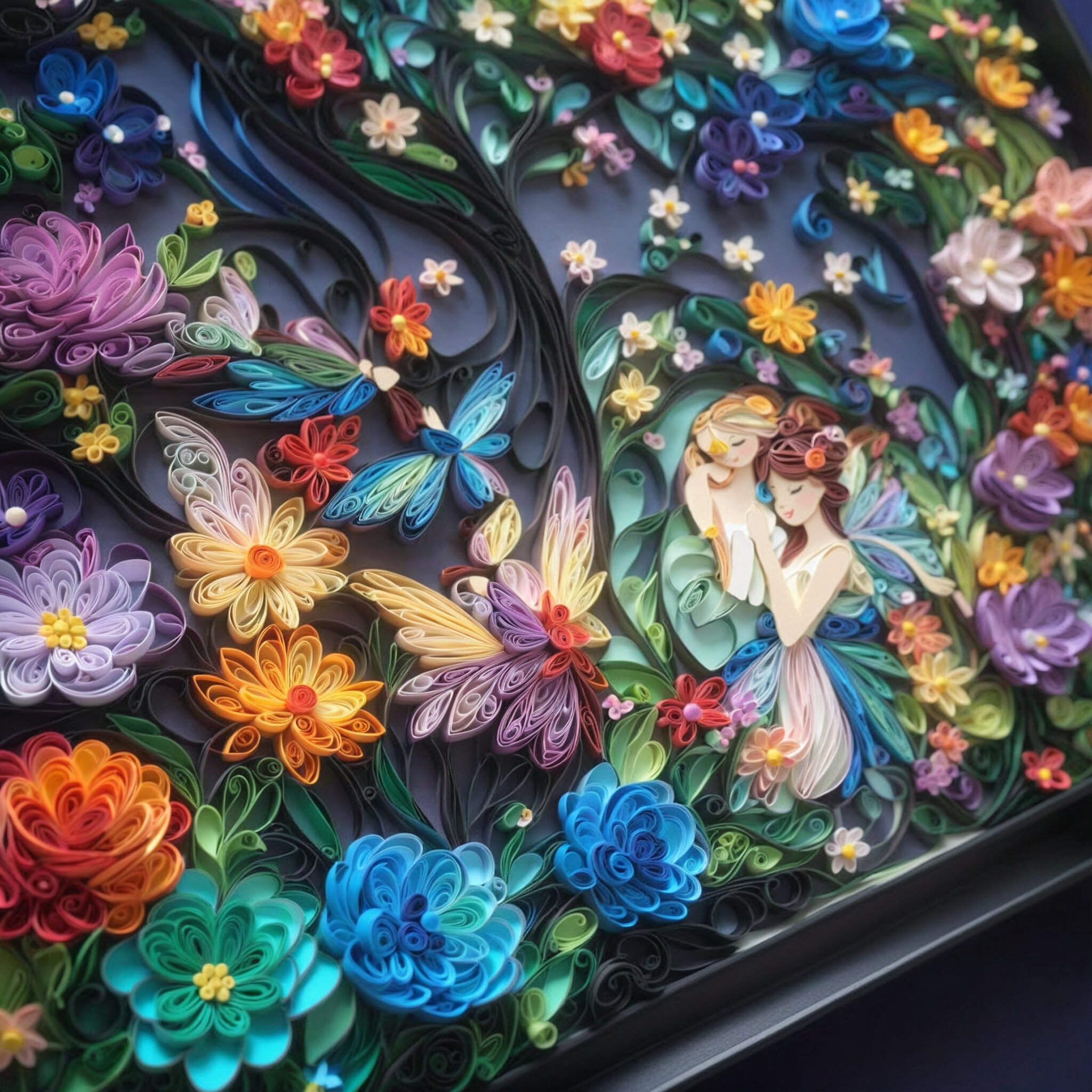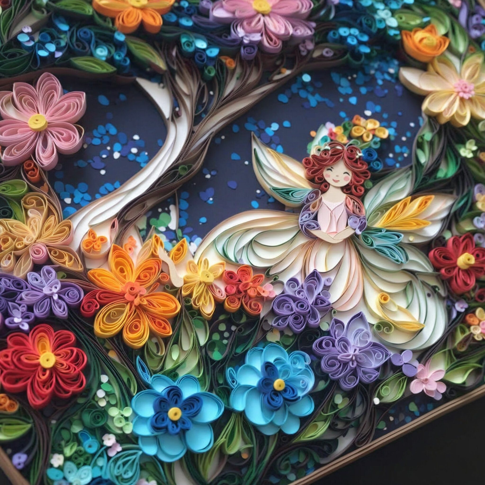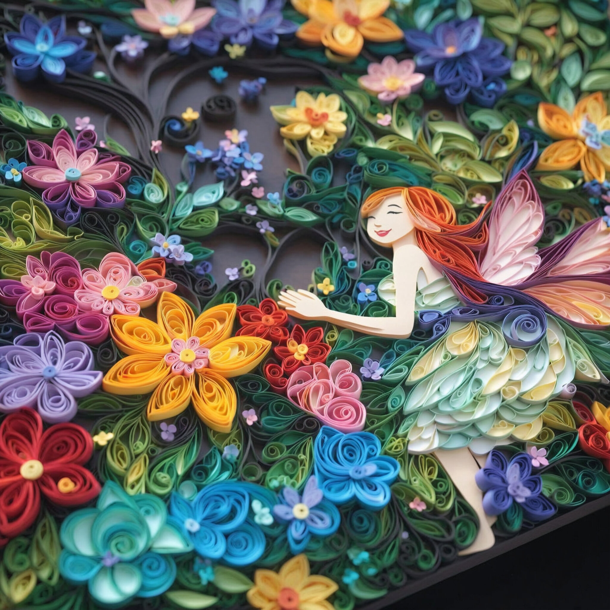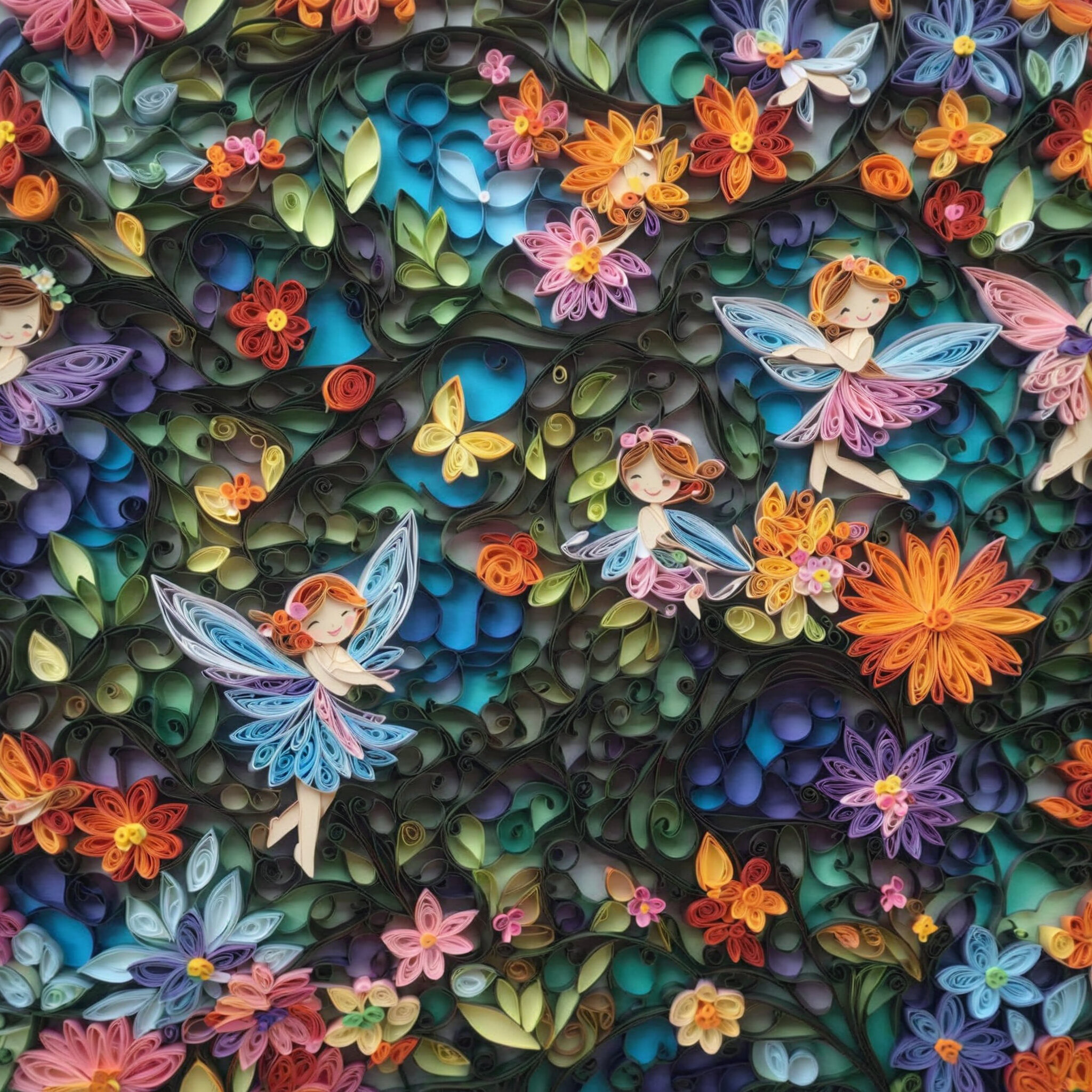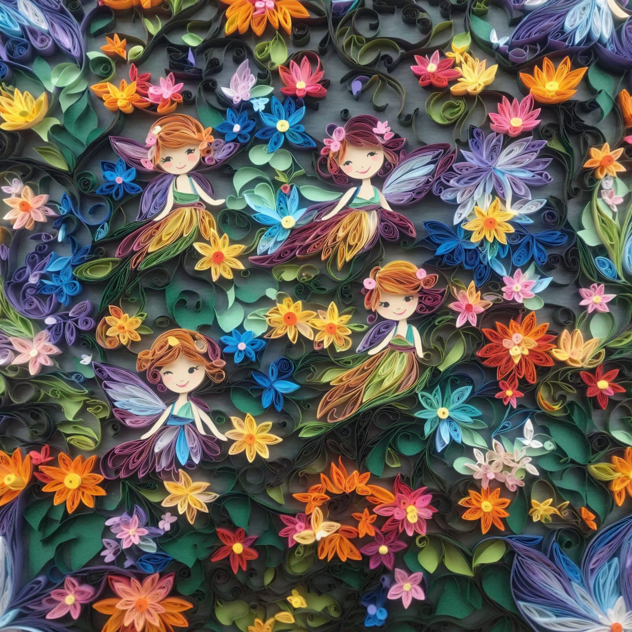 masterpiece, best quality, animation style, anime colored, illustration, "A vibrant, enchanting scene of 4+ childlike fairies gathered in a lush forest, joyfully chatting and laughing together, surrounded by an abundance of colorful, blooming flowers. The artwork is crafted in an intricate paper quilling art style, featuring delicate, curling, rolling, and coiling paper strips that form loops and ornamental patterns. The fairies’ wings and clothing are adorned with 3D, dimensional details, showcasing intricate shaping and vibrant colors. The forest is alive with vivid greens, sparkling dewdrops, and radiant blossoms, creating a whimsical, lively atmosphere that exudes joy and wonder.paper quilling art . intricate, delicate, curling, rolling, shaping, coiling, loops, 3D, dimensional, ornamental
