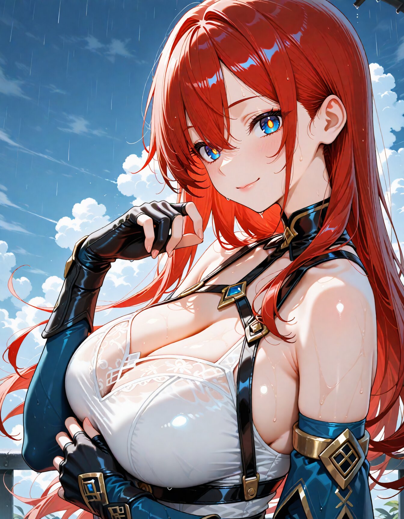 1girl, ultra detailed illustration, large breasts, long hair, beautiful face, Bright Red hair, rainy, outdoors, fingerless gloves, dress, detached sleeves, smile, blue sky, black gloves, yellow pupils, bare shoulders, breasts, from side, closed mouth, sky, cloudy sky, pink lips, long bangs, white dress, collarbone, glove, rain, cloud, looking at viewer, upper body, hand up, solo, blue sleeves, glove pull, looking to the side, blue eye, masterpiece, very aesthetic, newest, absurdres, safe,
