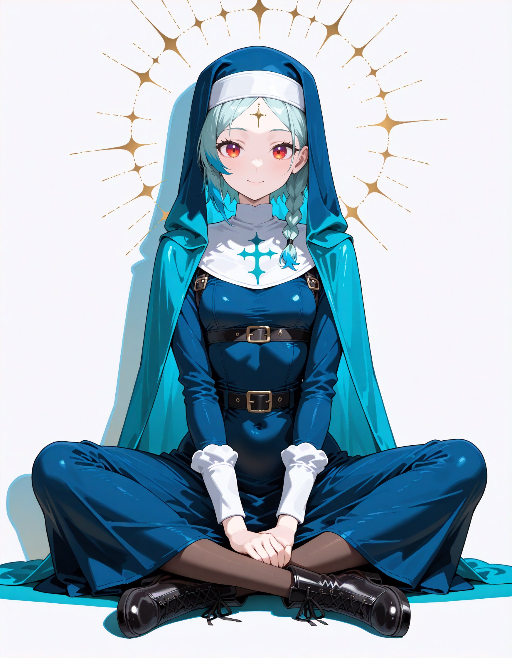front view (portrait:1.2) Low Horizon Surveillance viewpoint, looking at viewer, (simple white background:1.1), drop shadow, colored shadow, The background is a solid, bright chartreuse green, creating a striking contrast with the intricate, multi-colored design of the character, pop color background, (high saturation:1.2), summer coloring, 1girl, nun, beautiful detailed eyes, holy face, cool Elegant and sophisticated demeanor, (pale skin:1.0), skindentation, beautiful amber eyes, , aqua hair, cerulean blue colored tips, short hair, side braid,openforehead , soft hair, first-rate female bodies perfect body beautiful small breasts wide hips, narrow waist, solo, nun, Good texture Mystical Veil, aqua plain cape, cloak, sacred Stola, , the feel of fluffy, , belt buckle, chest belt, , , , long skirt, (silk overskirt:1.0), brown pantyhose, ankle boots, shiny smile, (cheerful smile:1.0), indian style super fine concept art, hard surface, graceful eyes, masterpiece, best quality, amazing quality, very aesthetic, absurdres, newest, professional art lots of details, , overexposure, shiny-glistening, (watercolor style:0.0), (pastel color style:1.0) <lora:noline (1):-0.8> <lora:sdxl2-flat2-512b:0.5> <lora:facelightup_xl_v10:0.5>