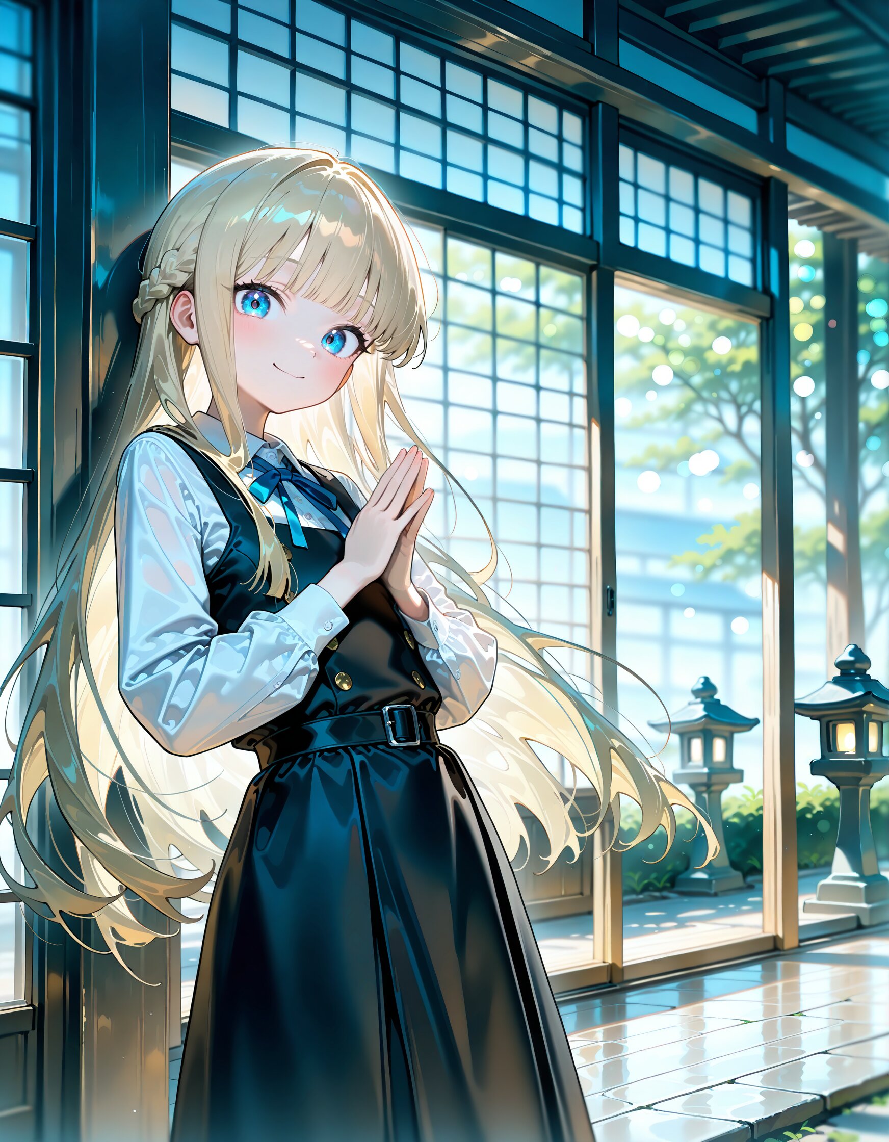 from behind, thrust out one's hip, looking back (character focus:1.0) from below, looking down (black Pinafore dress , blue neck ribbon, white blouse, 4gold buttons, 1girl (13yo:1.1), overly long sleeves very long hair, french braid, straight hair, hime cut, blond hair, blue eyes, closed mouth smile, doyagao, excited smile, join hands together in prayer:1.0), shouji, sliding doors, veranda, stone lantern, , depth of field, bokeh, caustics, afternoon, super fine concept art, hard surface, 8K, unreal engine, masterpiece, best quality, amazing quality, very aesthetic, absurdres, you can add scenery, (volumetric lighting), To make the background more distinctive. professional art lots of details, , overexposure, (watercolor style:1.0), (pastel color style:0.0) <lora:noline (1):-0.5> <lora:sdxl2-flat2-512b:0.2> <lora:facelightup_xl_v10:0.5>