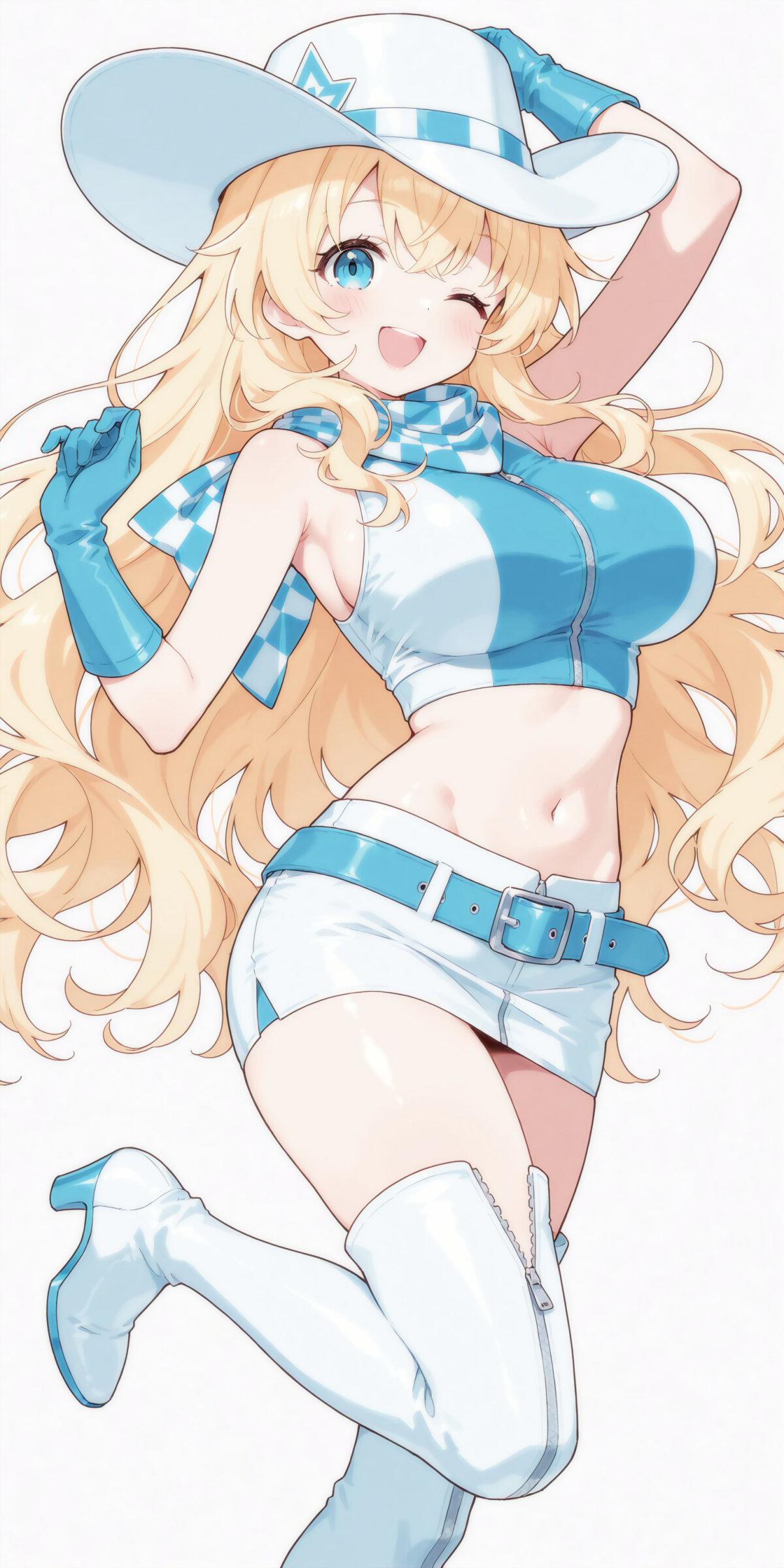 pink lips, dancing, blush, smile, open mouth, Wavy Hair, very long hair, blond hair, wink, blue eyes, large breasts, shiny white enamel cowboy hat with wide brim, white Ten-gallon hat on head, blue and white checkered flag scarf around neck, scarf around neck, checkered flag pattern on scarf, white and blue two-block color crop top with shiny enamel material, sleeveless, front zip, zip up, cropped design, stomach, navel, blue eyelet belt with buckle, slim-fit white enamel pencil skirt with cowboy motif fringe, mini skirt, white skirt, blue racing gloves, shiny white and blue two-block color enamel thigh-high boots with heels, ultra long thigh-high boots,