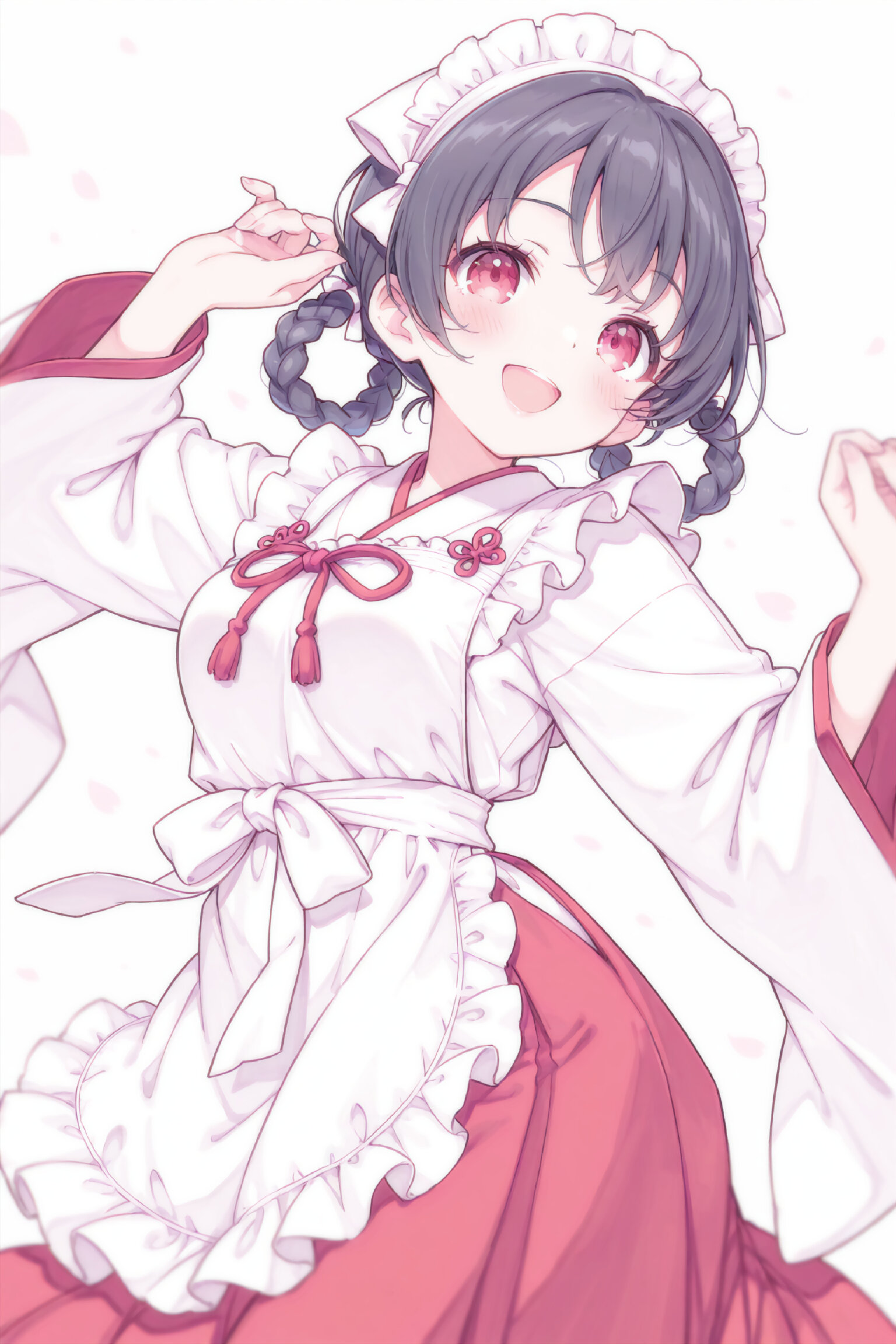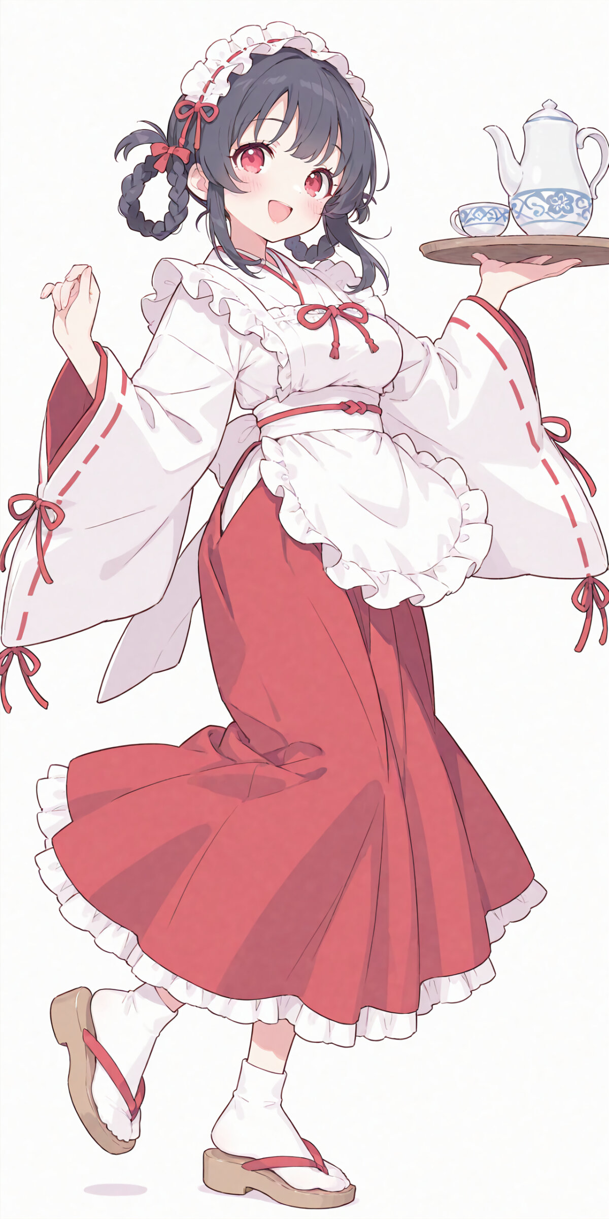 Braided hair rings, black hair, red eyes, medium breasts, Holding a wooden tray, Japanese white shrine maiden clothes, long red skirt, frill headband, white apron, white ankle socks, Sandals,