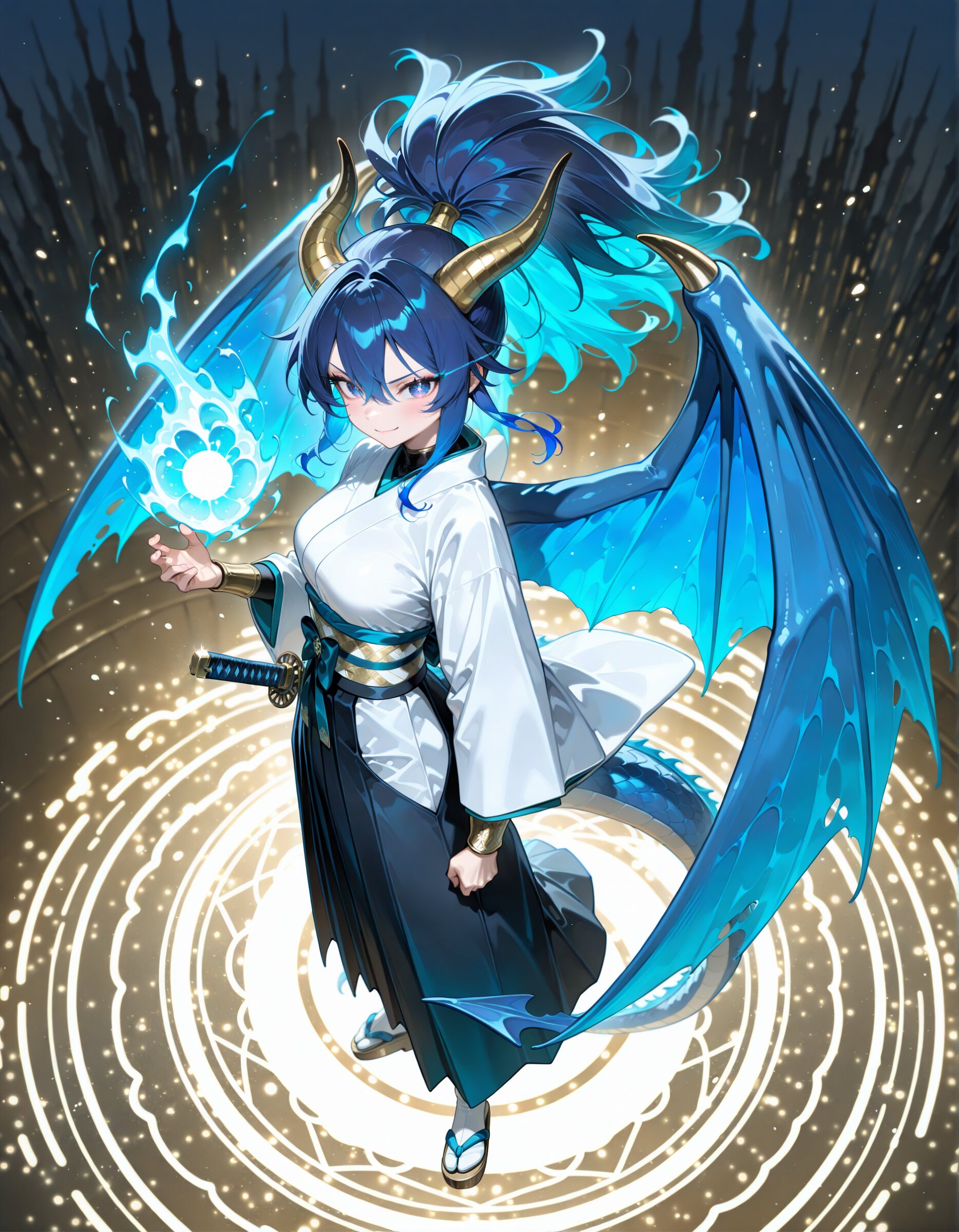 super fine concept art, hard surface, 8K, masterpiece, best quality, amazing quality, very aesthetic, absurdres, front view, (fisheye,fisheye lens angle:1.0), aerial view, looking down looking at viewer, dynamic angle, The silhouette is composed of dynamic, vertical-striped and vibrant square. The background is a solid, creating a striking contrast with the intricate, multi-colored design of the character, summer atmosphere. 1dragon girl, solo, from side, (from above:1.1), (wide shot:1.2), , dragon girl, 17yo, (2dragon gold horns attached to the head:1.2), blue hair high ponytail, pony tail hair, (wide ponytail:1.1), torn hair, (indigo blue eyes:1.1), cute, cool, (muscle,buff well-built body,ultra-detailed muscle:0.6), first-rate female bodies perfect body medium breasts tone hips Average height,indigo blue eyes, blue dragon tail, (2long blue dragon wings on back:1.1), dark blue hakama, (overskirt:1.2) White Japanese Clothes, (White wide sleeve:1.0) gold and white stripe obi, inner, bracer, straw sandals, tabi, (serious smile:1.0), v-shaped eyebrows, closed mouth, fighting smile, eye trail,, glowing japanese short sword, (japanese sword action:1.1), glowing sword katana wield a katana glint, (swirling blue energy,energy magic,energy:1.2), glowing eastern dragon blue aura, (swirling black ink effects:1.2) chasing, black motion blur, The background is a solid, bright dark green, creating a striking contrast with the intricate, multi-colored design of the character, (a lot of silhouette:0.0), pop color background, (high saturation:1.2), summer coloring, partly black ink wash effect, professional art lots of details, , overexposure, sumie effect style, 4ur4_illu,shiny, glowing, glowing particles, glowing light particles, light particles, flame dark green, <lora:noline (1):-0.5> <lora:sdxl2-flat2-512b:-0.2> <lora:facelightup_xl_v10:0.5> <lora:V2_yakumo_alchemy:0.5> <lora:Aura_illu:0.1>
