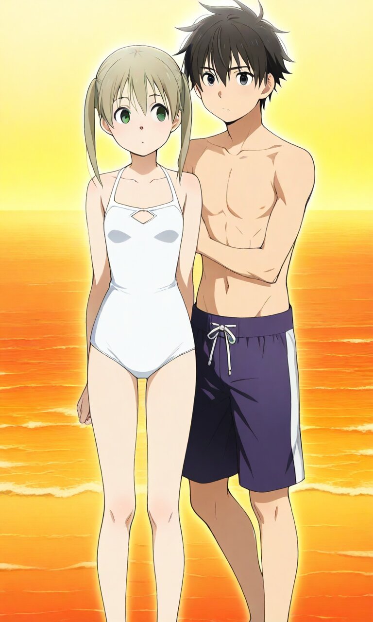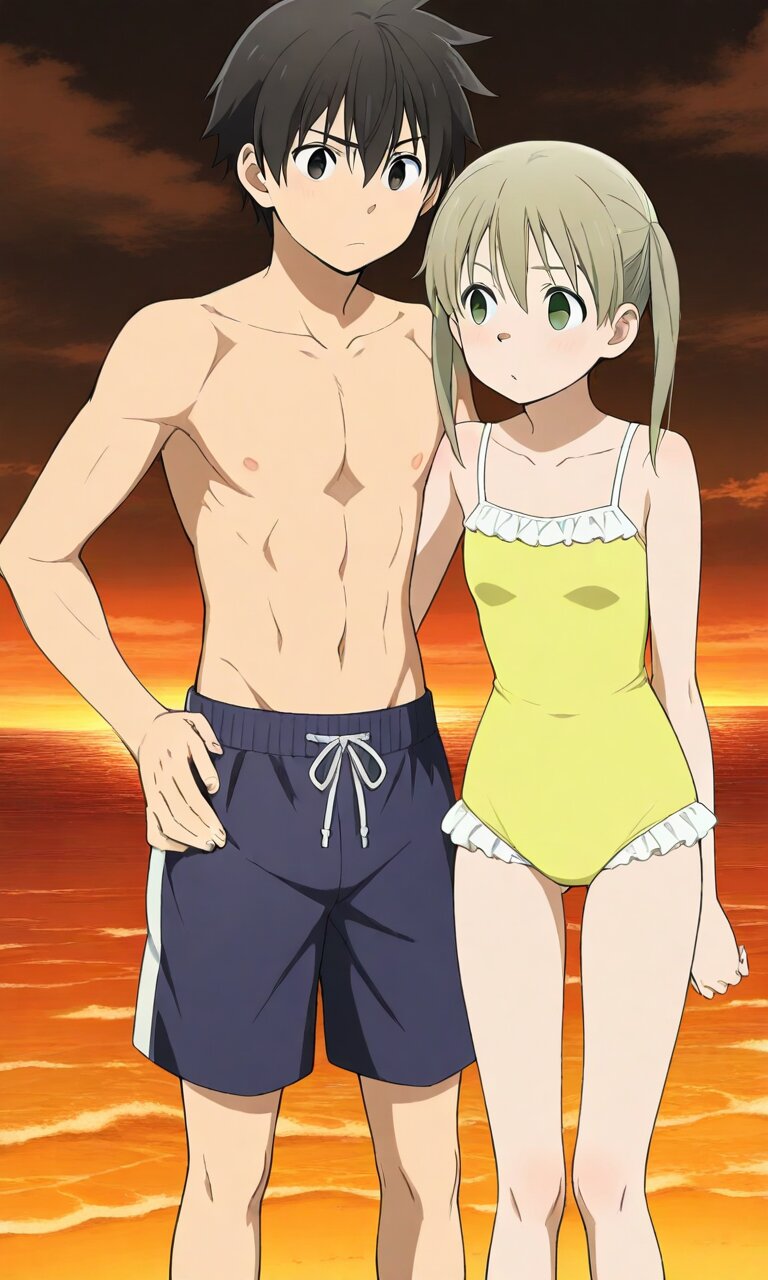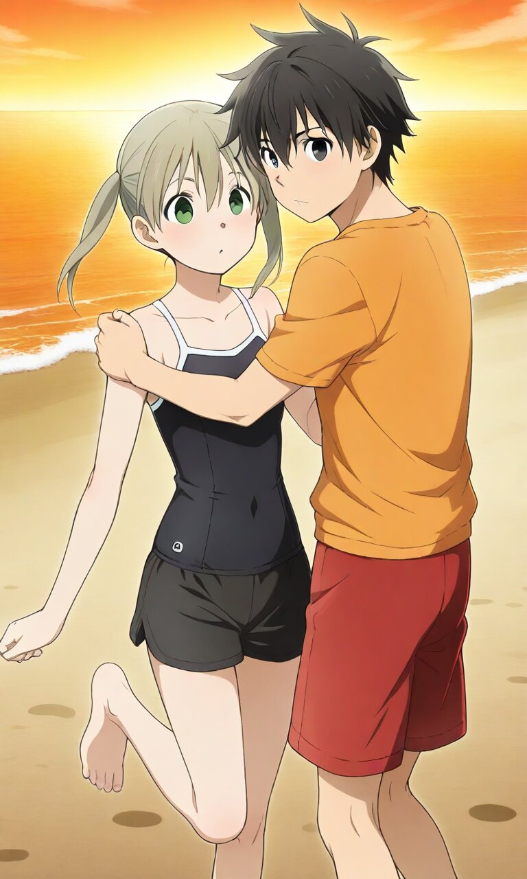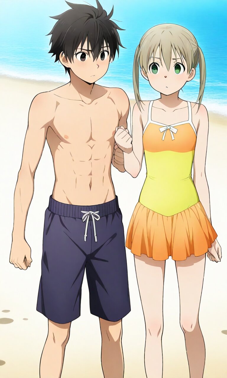 Couple, boy and girl, two people only,absurdres, ultra-detailed, master piece, high resolution, 8k, Boy, girl, couple,A joyful couple dances barefoot on a midsummer beach as the sun sets, casting an orange hue over the scene. The woman wears a sporty two-piece swimsuit with neon yellow accents, her laughter echoing as she twirls. The man, in simple navy swim trunks, spins her gently, their footprints marking the soft sand. A bonfire glows faintly in the background. BREAK the boy(original boy,black eyes, black short hair) BREAK the girl(maka albarn, blonde hair, twintails, green eyes, bangs, anime screencap ),
