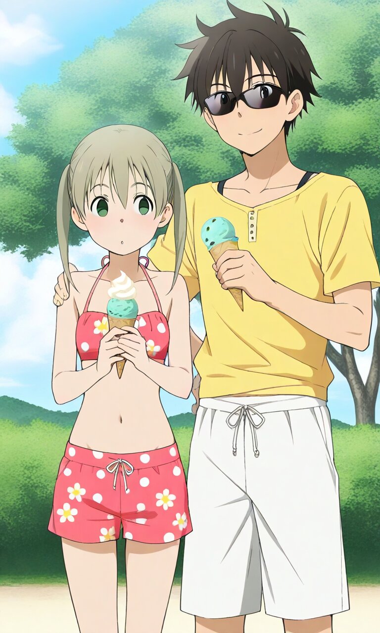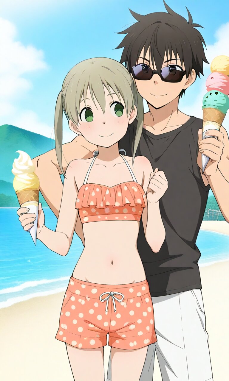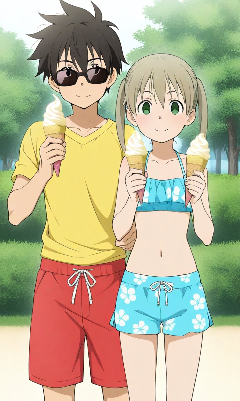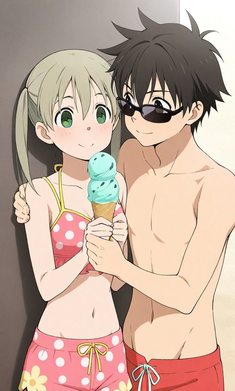 Couple, boy and girl, two people only,absurdres, ultra-detailed, master piece, high resolution, 8k, Boy, girl, couple,A couple strolls along a crowded midsummer beach, holding ice cream cones and laughing together. The woman wears a retro-inspired high-waisted bikini with polka dots, paired with oversized sunglasses. The man, in colorful floral swim shorts, has his arm around her. Seagulls soar overhead, and the lively hum of beachgoers fills the air. BREAK the boy(original boy,black eyes, black short hair) BREAK the girl(maka albarn, blonde hair, twintails, green eyes, bangs, anime screencap ),