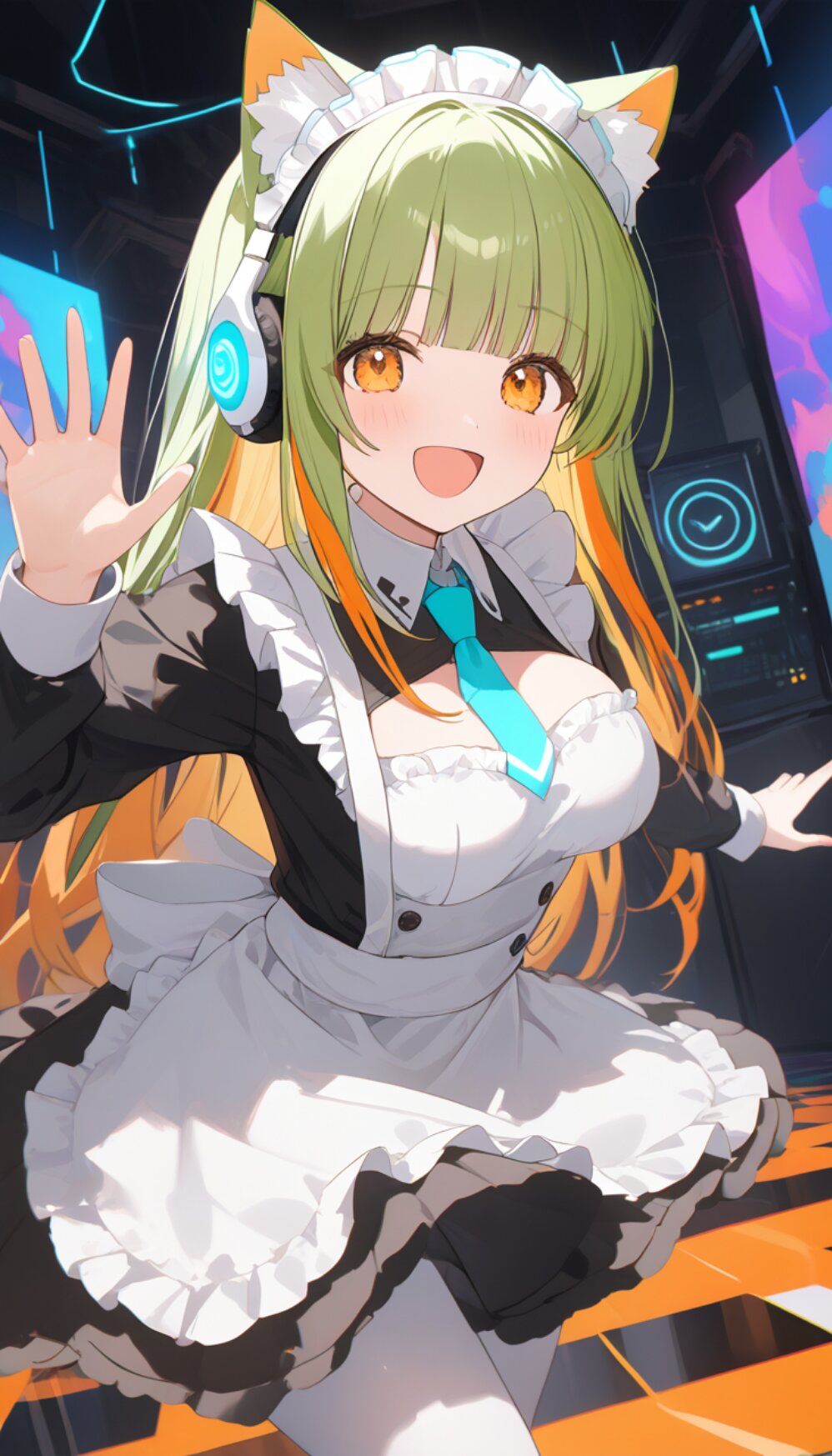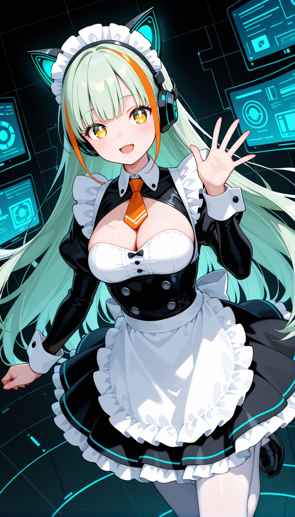 1 young girl, , masterpiece, high score, great score, best quality, ultra detailed, game cg, beautiful visual, super fine illustration, absurdres, kawaii, cute girl, high resolution,BREAK,detailed pupil, gold eyes, anime eyes, medium breasts,BREAK,(vivid light green hair:1), straight hair, blunt bangs, (orange streaked hair:1.4), long hair,BREAK,cyber cat ear headphone, glowing mechanical cat ears, circuits running on ears,BREAK,cyber maid outfit, black and silver color scheme, glowing circuit patterns on apron and chest only, white apron with hologram shimmer, maid headpiece with digital interface,necktie,cleavage,BREAK,white pantyhose with neon lines, cyber loafers with glowing sole, elegant folds, synthetic fabric,BREAK,healthy body, curvy waist, natural proportions,BREAK,eyes looking slightly up, smile, open mouth, waving both hands, happy,BREAK,standing, from front, cowboy shot, dutch angle,BREAK,abstract paint splatter background, large colorful brushstrokes, modern art backdrop, artistic abstract painting, clean art gallery wall, paint smear, no digital elements in background,BREAK,high contrast, glowing accents on outfit only,