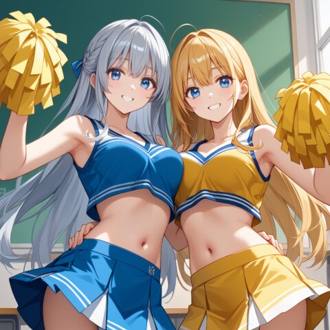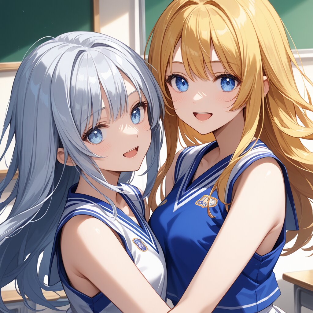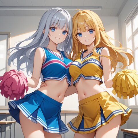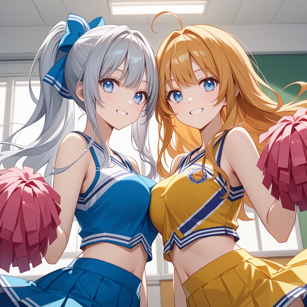 score_9,score_8_up,score_7_up,source anime,best quality,masterpiece,8k,extremely detailed CG unity 8k wallpaper,close-up,dynamic_angle,classroom, 2girls,(another color clothes each other:1.2),ultra detailed eyes,cheerleaders,smile,Slightly_open_mouth, ADDCOMM, (silver long hair),light blue eyes, ADDCOL, yellow long hair,blue eyes,