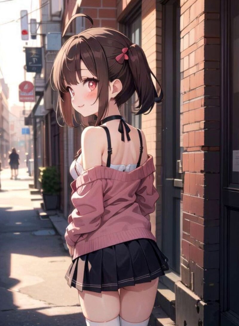 High pigtails, 1 girl, solo, (((loli0.5))), blurry background, dark brown hair, short hair, ahoge, evil smile, red eyes, bangs pinned back, slanted eyes, sparkling pupils, cherry pink lips,Summer, pink off-shoulder cardigan, black underwear, choker, shoulder straps, micro mini skirt, pleated skirt, frills, white thigh-high socks, zettai ryoiki, badge, blush, :t, turning around, from behind, back alley, alleyway, daytime, sunny