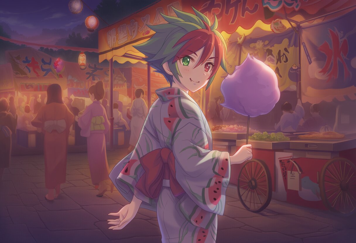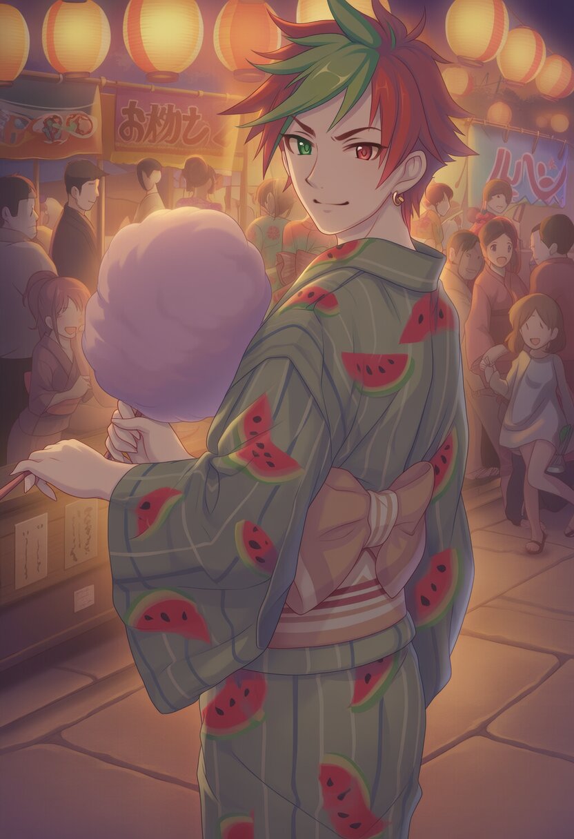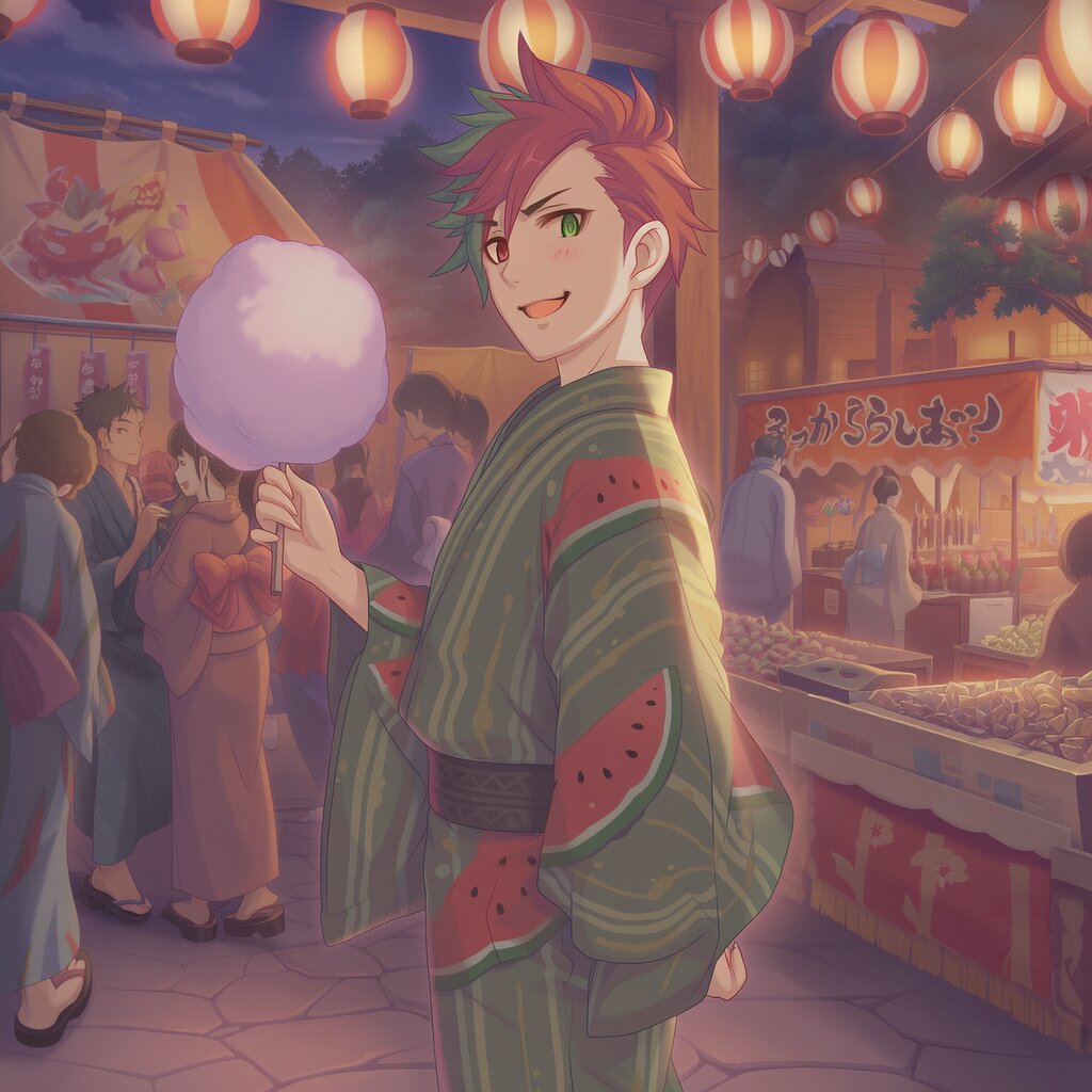 {{{highly detailed}}}, {{official style}}, {{game cg}}, {{cygames style, princess connect!}}, {{{male face, male eyebrows, male eyes}}}, {{sharp nose}}, {{facial muscle}}, {{bishounen}}, {{adult male}}, 1boy, solo, {{heterochromia, red eyes, green eyes}}, {{spiked hair}, {{{{{{{{very short hair}}}}}}}}}, {two-tone hair:1.5}, {green and red hair}, {{two-tone hair, red hair, green hair}}, swept bangs, flat chest, walking, looking back, cowboy shot, happy, {{{watermelon-patterned yukata}}}, {{{{eat a cotton candy}}}}, smile, night, festival, food stand, multiple boys, crowd, multiple girls, {{{masterpiece}}}, {{{best quality}}}, {{{very aesthetic}}}, {{{ultra-detailed}}}, {illustration}, {{{extremely detailed}}}, {{{an extremely delicate and beautiful}}}