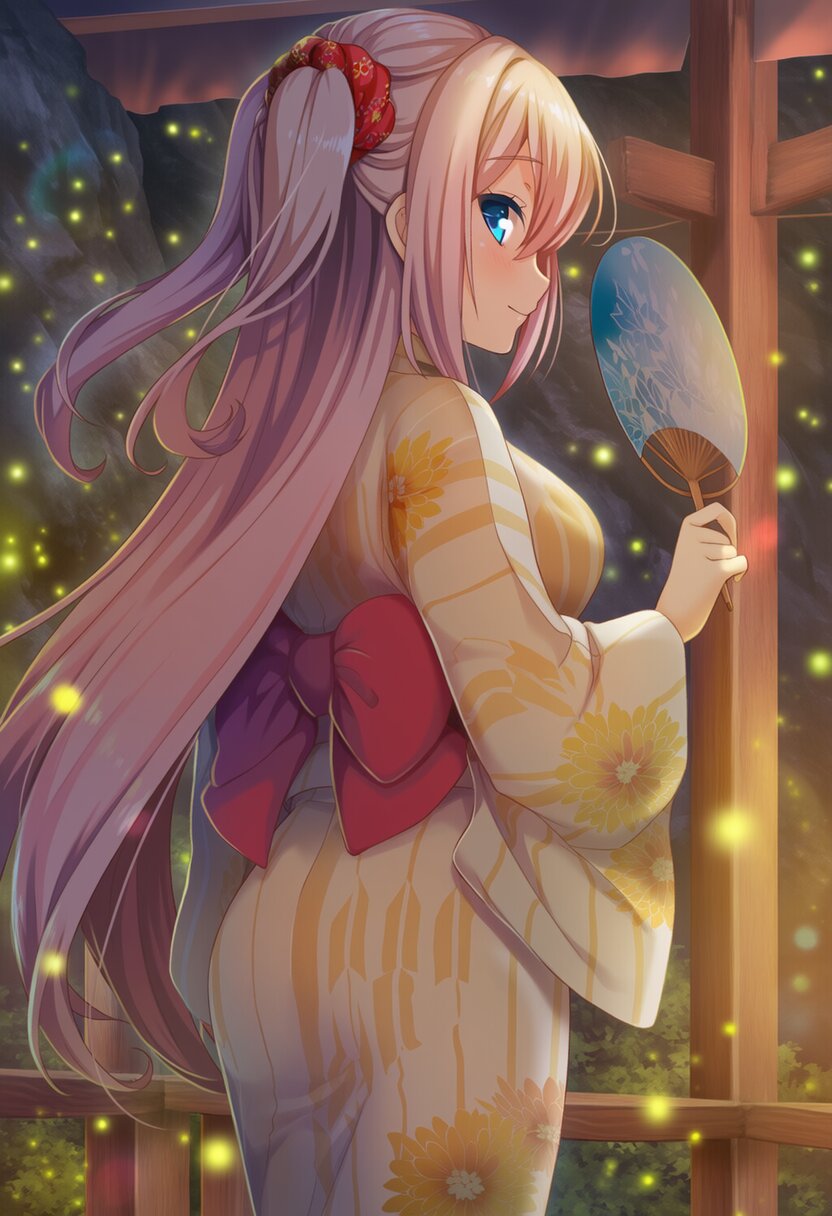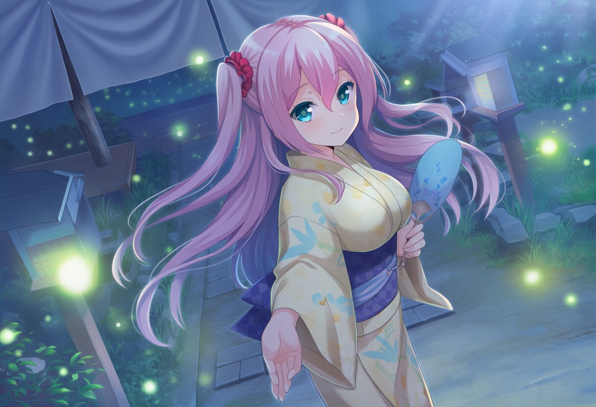{{{highly detailed}}}, {{official style}}, {{game cg}}, {{tenka hyakken, girlfriend (kari)}}, 1girl, solo, blue eyes, {{very long hair, pink hair, straight hair, two side up, hair between eyes}}, {{hair red scrunchie}}, {{happy}}, {{light smile}}, large breasts, walking, looking back, cowboy shot, happy, {{{light yellow yukata}}}, {{{{hold a fan}}}}, night, {{{fireflies}}}, {{{masterpiece}}}, {{{best quality}}}, {{{very aesthetic}}}, {{{ultra-detailed}}}, {illustration}, {{{extremely detailed}}}, {{{an extremely delicate and beautiful}}}