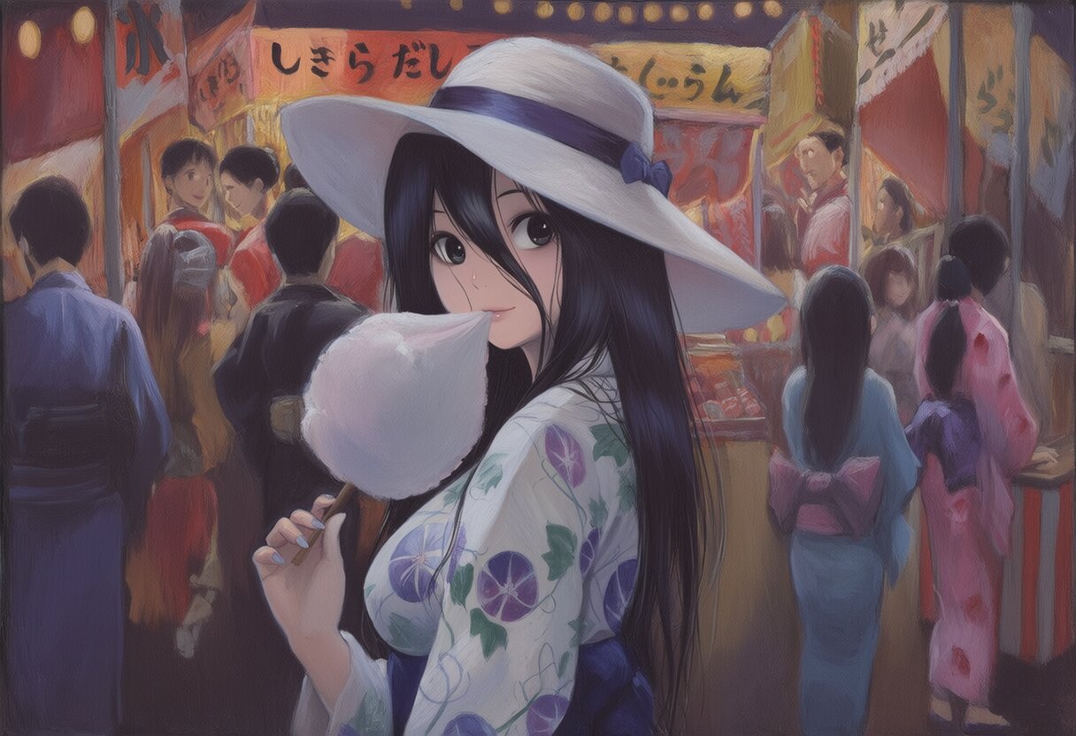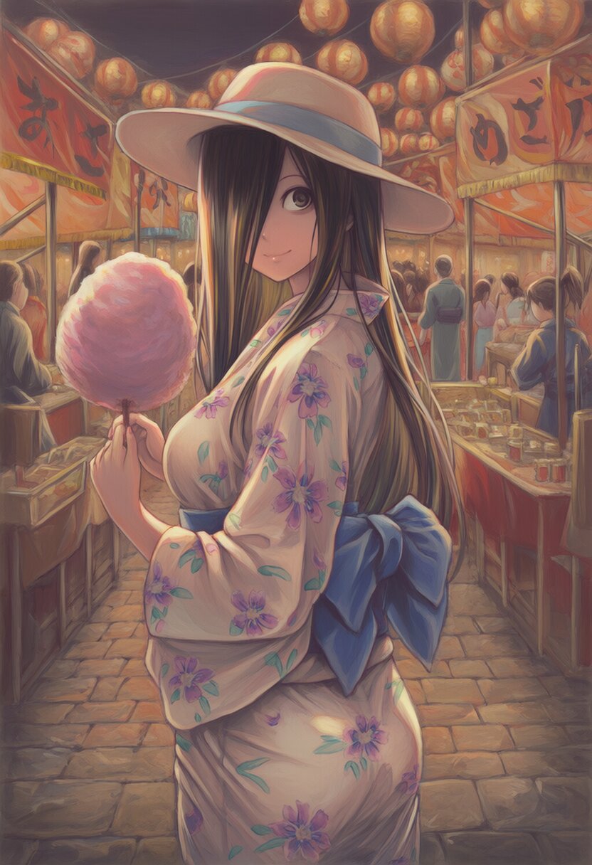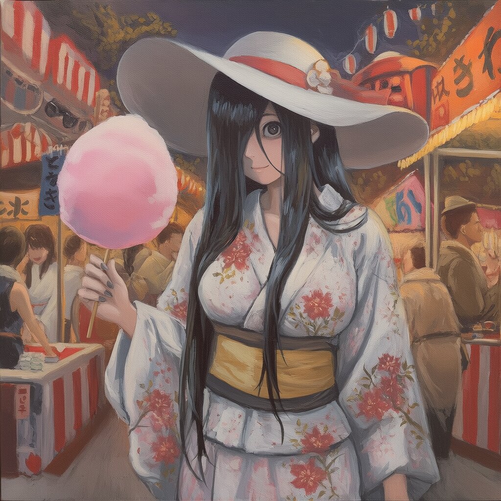 {{{highly detailed}}}, {{{8k}}}, {{{beautiful detailed}}}, {{intricate}}, {{{{{acrylic paint (medium), acrylic paint style}}}}}, {{{{{yamamura sadako}}}}}, large breasts, long hair, sundress, black hair, black eyes, put on sunglasses, hair between eyes, happy, light smile, solo, cowboy shot, white hat, {{white kimono with flower pattern}}, {{{{{eat cotton candy}}}}}, smile, looking back, standing, cowboy shot, night, festival, food stand, multiple boys, crowd, multiple girls, {{{masterpiece}}}, {{{best quality}}}, {{{very aesthetic}}}, {{{ultra-detailed}}}, {illustration}, {{{extremely detailed}}}, {{{an extremely delicate and beautiful}}}
