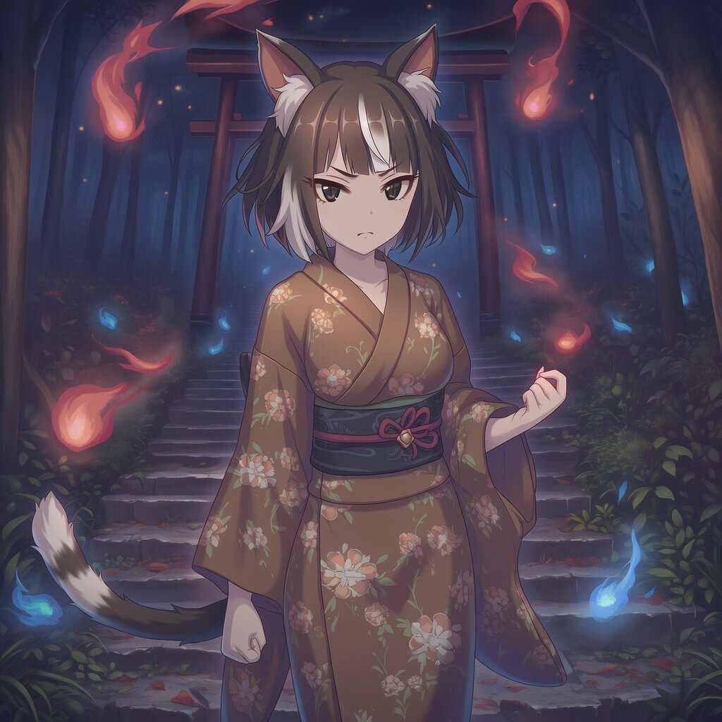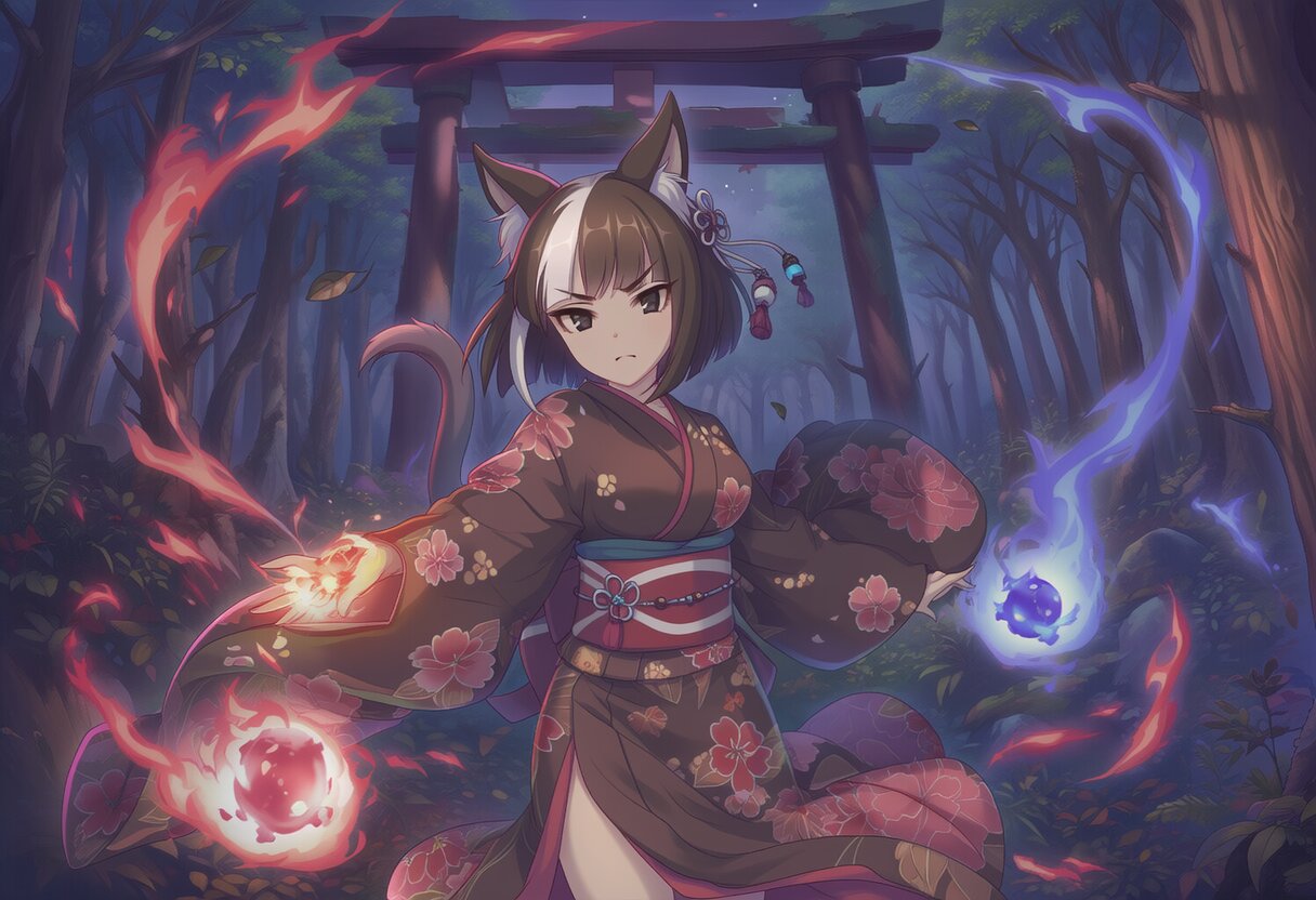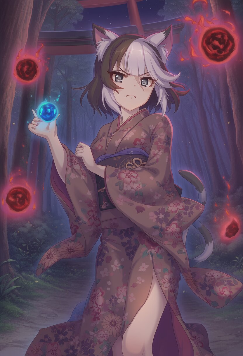 {{{highly detailed}}}, {{official style}}, {{game cg}}, {{intricate}}, style of ai-generated, {{cygames style, princess connect!}}, {{slender}}, 1girl, solo, black eyes, {{{tsurime}}}, {{angry, serious}}, {{{white hair, dark brown hair, two-tone hair}}}, cat ears, cat tail, short hair, straight hair, blunt bangs, medium breasts, {{{brown floral yukata}}}, cowboy shot, standing, {{{red fireballs, blue fireball}}}, night, forest, torii, {{{masterpiece}}}, {{{best quality}}}, {{{very aesthetic}}}, {{{ultra-detailed}}}, {illustration}, {{{extremely detailed}}}, {{{an extremely delicate and beautiful}}}