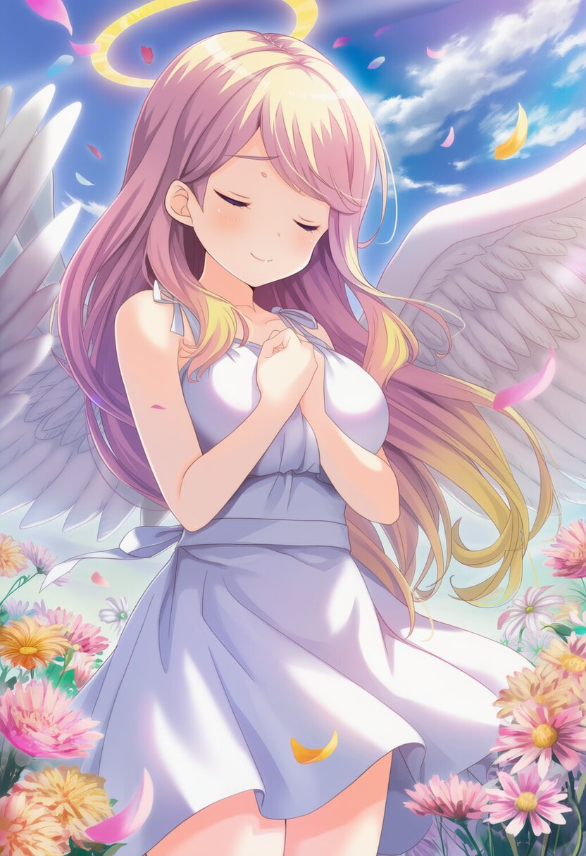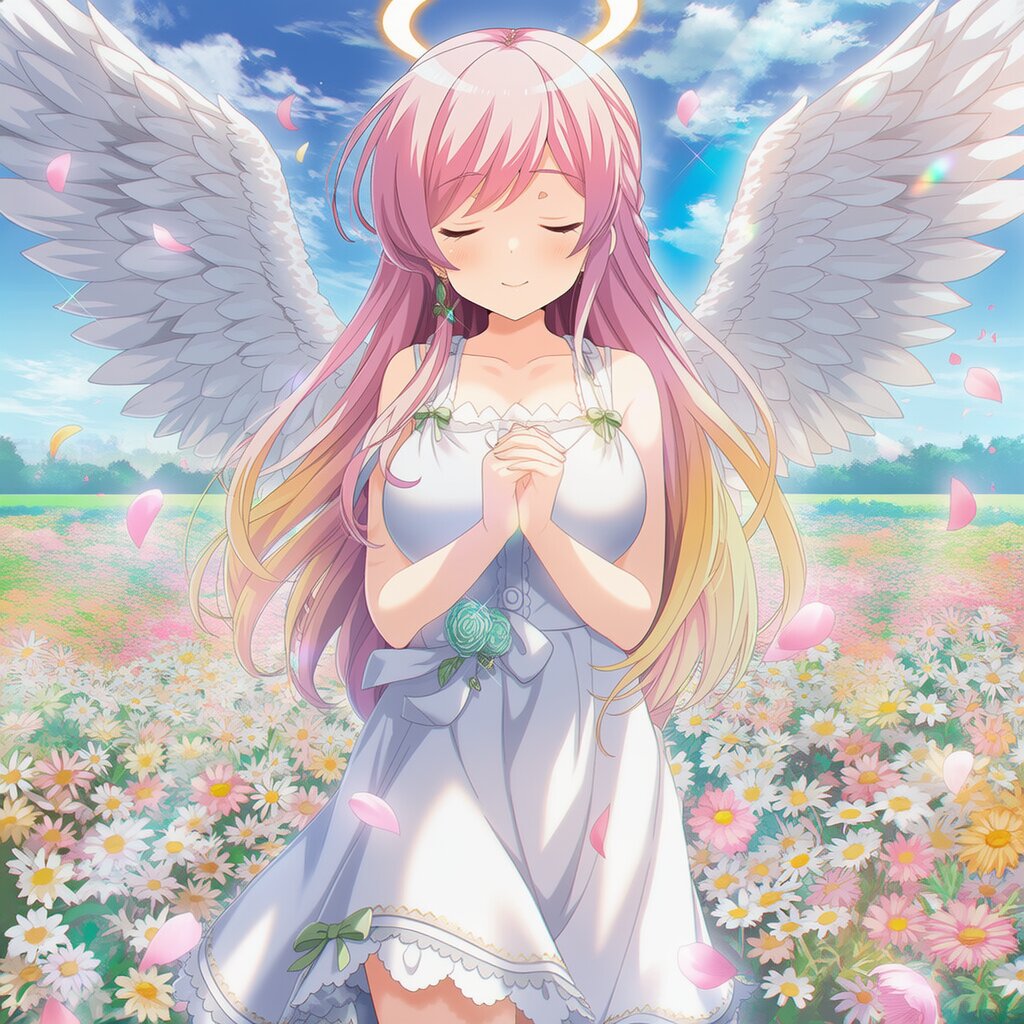 {{{highly detailed}}}, {{official style}}, {{game cg}}, {{{girlfriend (kari)}}}, 1girl, solo, closed eyes, {{{long hair, gradient hair, pink hair, yellow hair, swept bangs}}}, [[[large breasts]]], {{sad smile}}, closed mouth, standing, {{{bare shoulders, white one-piece dresses}}}, {{angel wings, halo}}, {{{own hands clasped}}}, cowboy shot, blue sky, wind, falling blossoms, pink yellow flowers, pink flowers, stella alpina flower, daisies, pinks, lots of little daisies, pink flower, soft flowers, chrysanthemum, daysies, flowers blooming, chrysanthemums, blooming flowers, alexis flower, colourful, {{{masterpiece}}}, {{{best quality}}}, {{{very aesthetic}}}, {{{ultra-detailed}}}, {illustration}, {{{extremely detailed}}}, {{{an extremely delicate and beautiful}}}