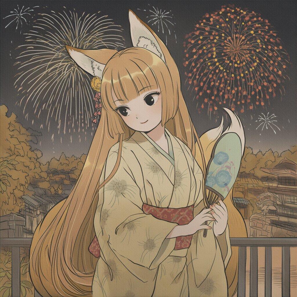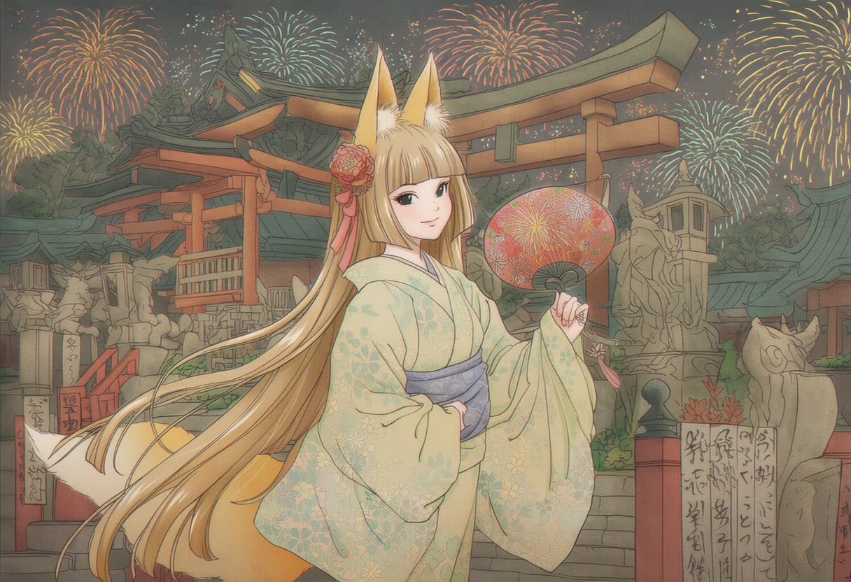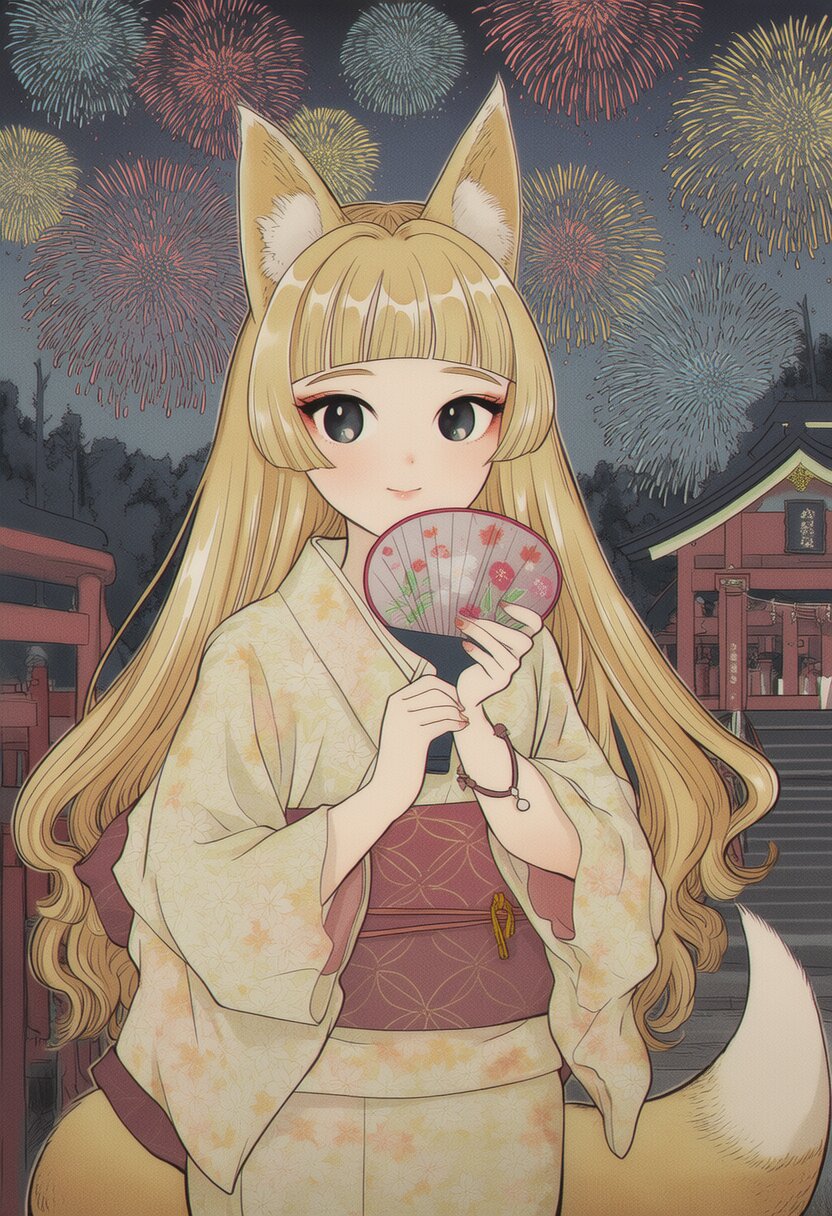 {{{highly detailed}}}, {{{8k}}}, {{{beautiful detailed}}}, {{intricate}}, {{{{{ukiyo-e, nihonga}}}}}, {{slender}}, 1girl, solo, black eyes, {{happy, light smile}}, blonde hair, {{{fox's ear, fox tail, fox girl, animal girl}}}, long hair, shiny hair, blunt bangs, {{light yellow yukata}}, {{{holding a fan}}}, {{standing}}, cowboy shot, night, shrines, torii, trees, {{{fireworks}}}, night sky, {{{masterpiece}}}, {{{best quality}}}, {{{very aesthetic}}}, {{{ultra-detailed}}}, {illustration}, {{{extremely detailed}}}, {{{an extremely delicate and beautiful}}}
