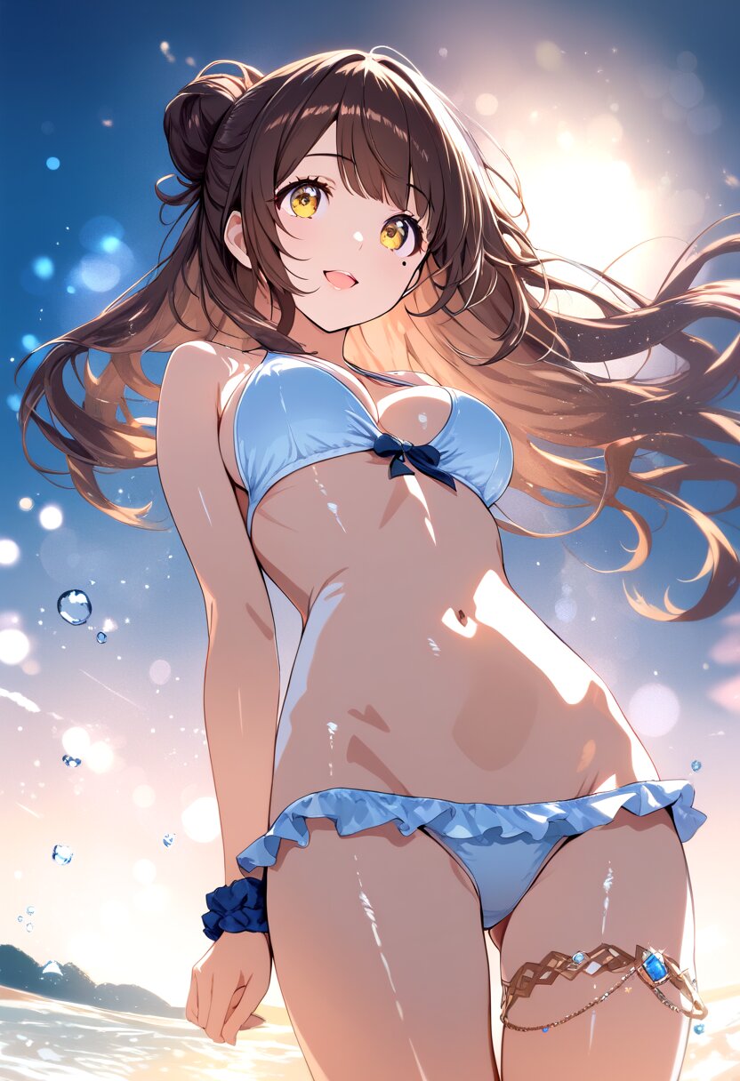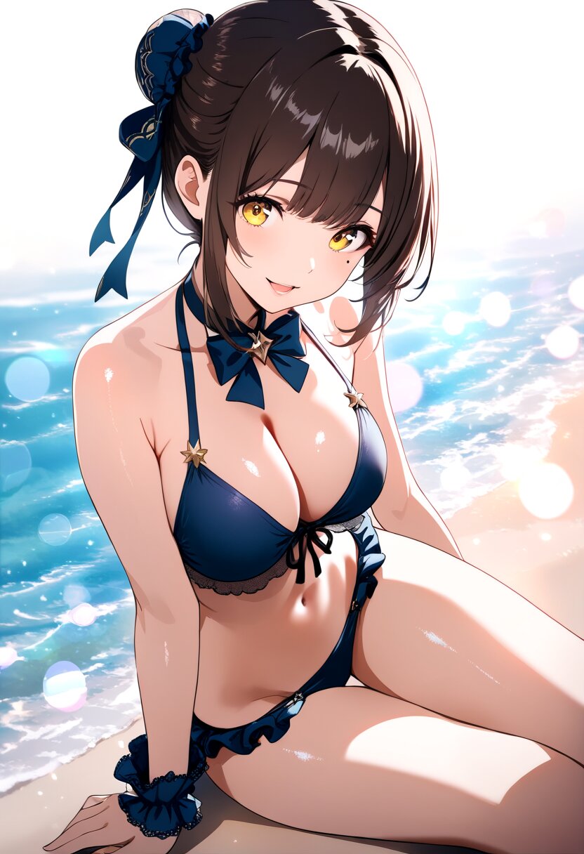 1girl, cute, petite, dark brown hair, single hair bun, fishnet bun cover with bowtie, tareme:1.4, dark yellow eyes, mole left under eye, looking up, beautiful lips, pink lips, glossy lips, half open mouth, smile, large breasts, frilled bikini, (((lowleg bikini, ))) wrist scrunchie, leg ring, sitting, Light spills, from below, beach, cute background, bokeh:1.4, Dreamy Blur, light particles, light sparkles, caustics, light leaks, Wide shot,