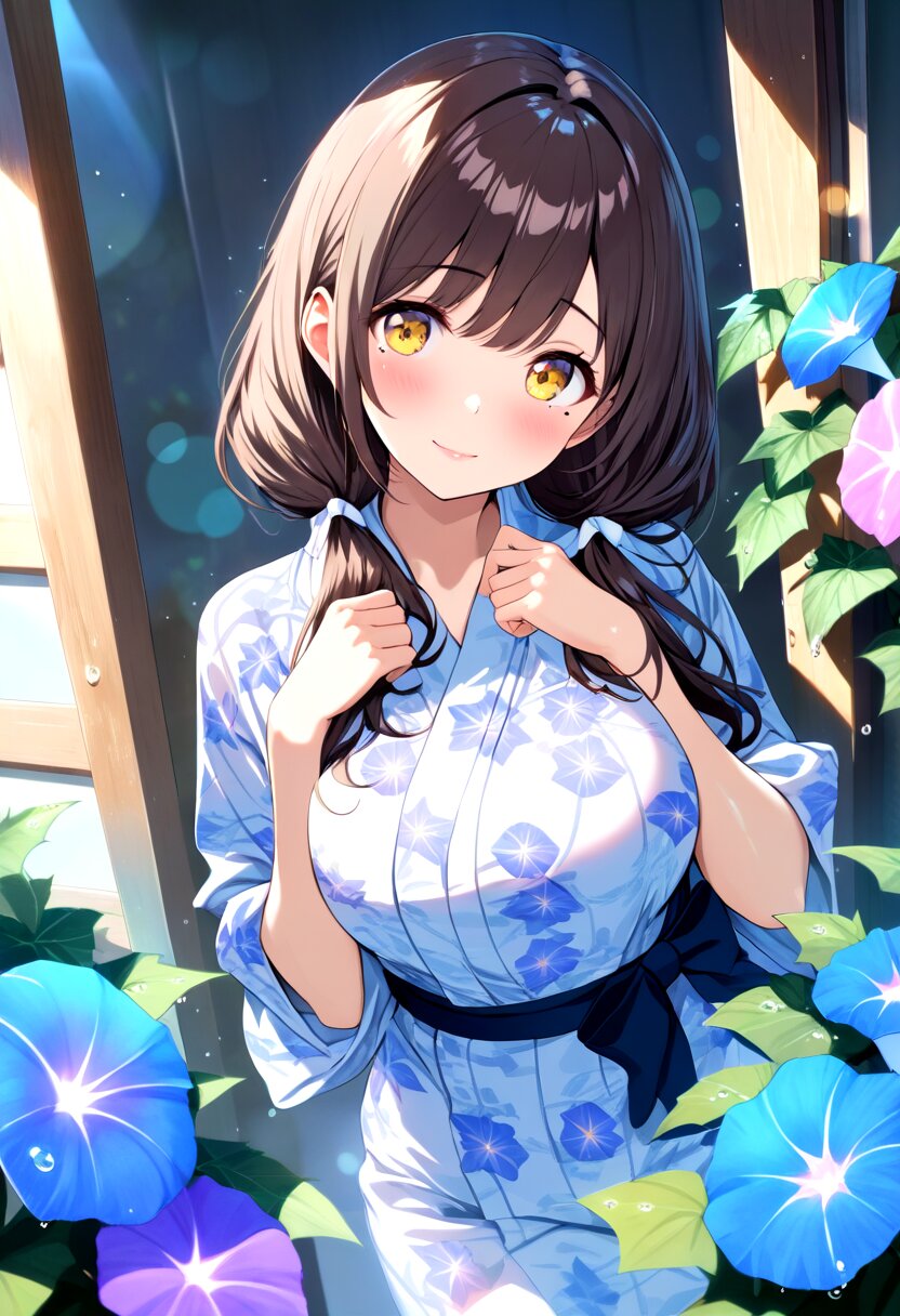 1girl, cute, petite, dark brown hair, long hair, Fluffy low twintails, head tilt, tareme:1.4, dark yellow eyes, solid oval eyes, mole left under eye, beautiful lips, pink lips, glossy lips, embarrassed smile, blush, floral print yukata, large breasts, dynamic angle, morning, Iris flower, dew drop, bright dew drop, bokeh, Dreamy Blur, light particles, Wide shot,