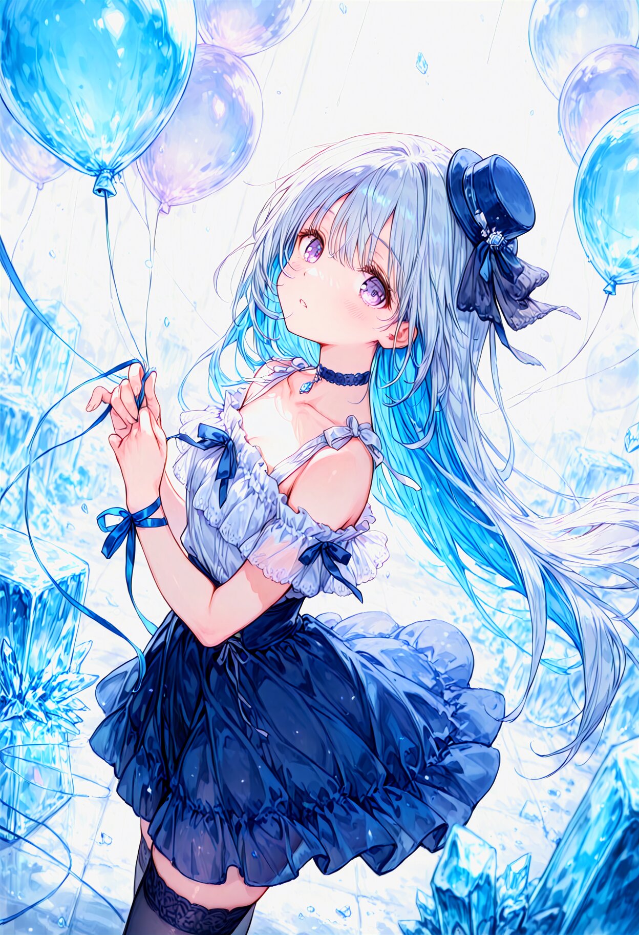 beautiful detailed background, best quality, (pale color:0.8), (pastel colors,:0.8) (holding ,:1.2) balloon,meny balloon,Balloons with strings, collarbone, parted lips,(Expressionless:0.8), big eyes,(half-closed eyes:0.8), tareme, pale purple eyes, thighhighs, (silver hair:1.1), (dark blue hair colored inner hair:0.8), long hair,very long hair eyebrows visible through hair, white off-shoulder and dark blue skirt, see-through veil, mini hat, blue strapping ribbon and bow, frills, strapping ribbon, choker, temptation, crystal, many ice block, looking at viewer, from side, narrow angle, <lora:noline-16oa:-0.4> <lora:sdxl2-flat2-512b:-1.0> <lora:sdxl-shadow_01:-0.7>, <lora:LECO_BadHands:-0.5>