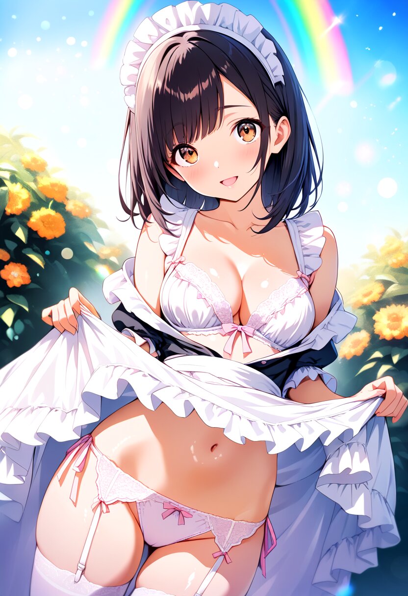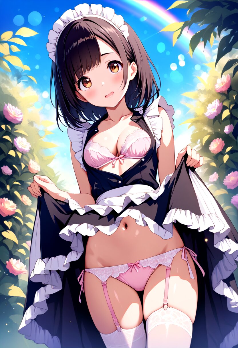 1girl, petite, cute, dark black hair, medium hair, straight hair, right diagonal bangs, head tilt, maid headdress, tareme:1.4, beautiful brown eyes, looking at viewer, upturned eyes, beautiful lips, pink lips, glossy lips, half open mouth, embarrassed, anguish smile, blush:1.4, maid, frilled dress, frilled sleeves, maid apron, unbuttoned, back ribbon, collarbone, medium breasts, cleavage, white lace bra lift, top tie, navel, skirt lift, low leg white lace panties with side tie, zettai ryouiki, thighhighs, pastel pink garter straps, standing, seduce, closed legs, dutch angle, straight-on, outdoors, garden, blue sky, rainbow, bokeh, Dreamy Blur, light particles,