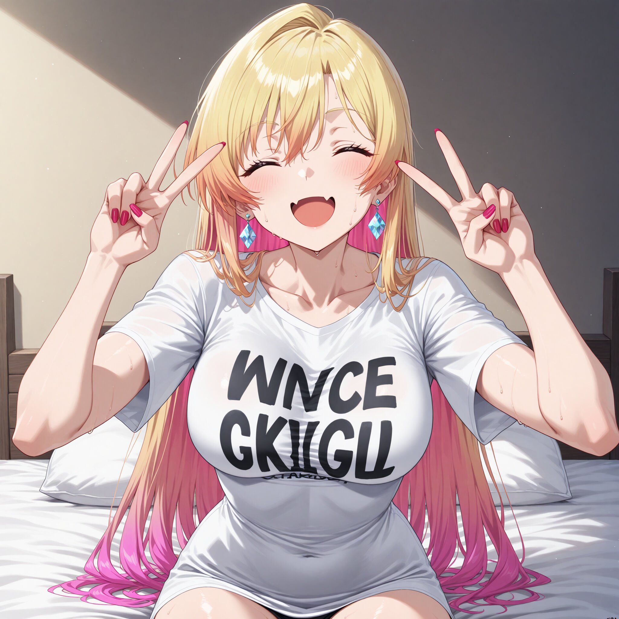 (1woman), BREAK, (((blond long hair, Straight Hair:1.5))), ((sharp bangs:1.3 )),((Long sideburns)),(((red eyes))), (slanted eyes), slender, (sweat:0.8), shiny body, shiny skin, (full breasts:1.3), Tight, tight waist, toned body, (muscular abs, abs:0.7), muscular BREAK, ((diamond-shaped earrings:1.5)), chains, chain accessories, (((pink inner hair, gradient hair from blond to pink:1.6))), skin fangs, Long nails, red nail polish, gorgeous nail polish, pubic hair ((T-shirt with 100 written on it:2)), ((eyes closed, smiling, mouth open:1.3)), happy, (((peace sign, peace sign with both hands))), cushion on lap, sitting on bed Clear eyes, beautiful eyes, beautiful face BREAK, ((newest, anime, animation, anime screen capture, anime style:1.2)) BREAK, ((masterpiece, , vibrant, very aesthetic, highly detailed, best quality, 16k:1.2)) Perfect hands, perfect fingers,