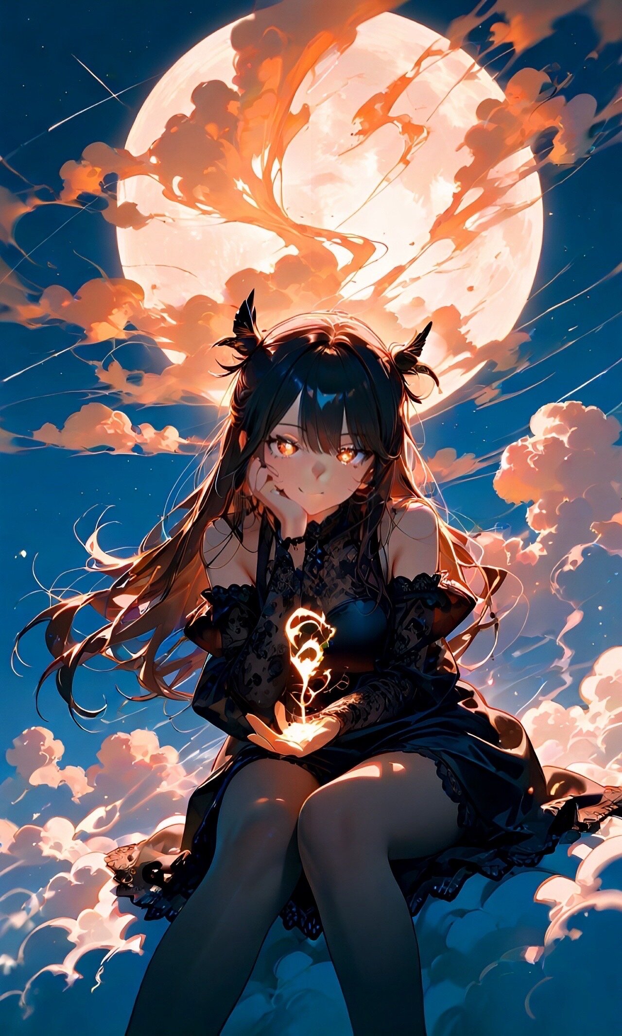 (masterpiece:1.1),best quality,ultra_detail, a beautiful girl sitting deeply into extremely fluffy, soft, glowing clouds, above the clouds, shrouded in cloud, (sit on a cloud:1.1),(she sinks slightly into the clouds, which look like cotton or marshmallows:1.3), the clouds billow gently under her, rainbow,the sky above is filled with twinkling stars, and black feathers drift down around her,she crosses her legs gracefully, resting her cheek on her hand, head tilted, with a bewitching, seductive smile that enchants the viewer,long flowing dark hair blowing gently in the breeze,she wears a dress made of sheer black lace, see through fluffy sleeve, medium breast,adorned with delicate black floral embroidery, the fbric slightly translucent, gothic elegance,a soft full moon behind her casts a gentle glow on her bare shoulders and flowing dress,(stars twinkling brightly, soft mist, glowing particles floating around her:1.1),a dreamy, magical, serene mood, cinematic lighting, surreal and enchanting atmosphere