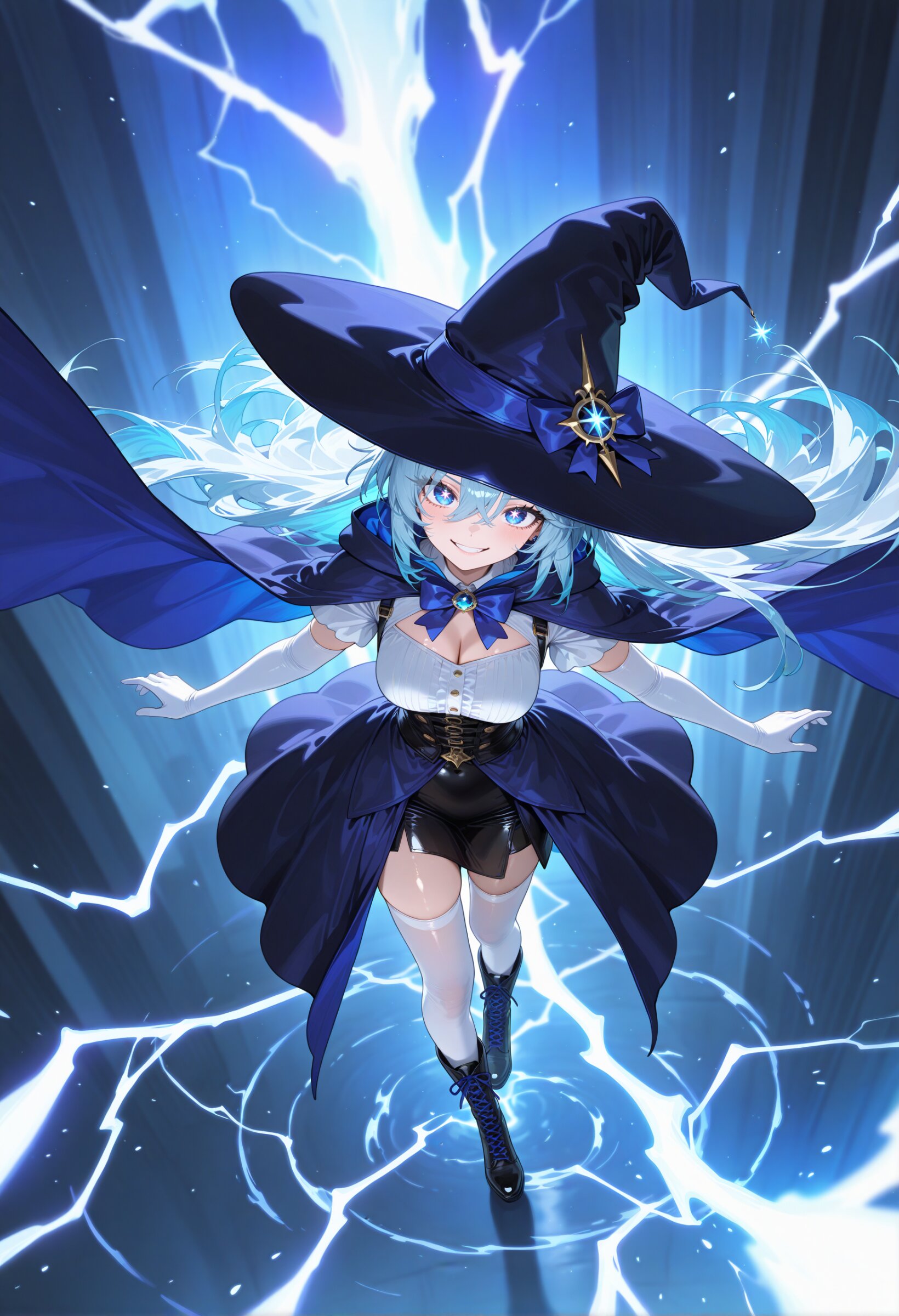 (wide shot:1.0) (from above,looking up:1.2) looking at viewer, 1girl, witch girl, blue eyes, beautiful iridescence eyes, beautiful detailed eyes, beautiful light blue hair, long bangs, long disheveled beautiful hair, first-rate female bodies, perfect body, beautiful breasts, framed breasts, cool face, (Beautiful Lips:0.7),, (stylish beautiful witch dress:1.2), white elbow gloves, (cute blue and dark blue witch girl costume:0.9), (white blouse:1.3), bow tie, witch long skirt (overskirt:1.1) green cape, (blue galaxy witch hat:1.1), lace-up boots on feet, stockings and suspenders,, mysterious face, smirk,contempt , thunder magic, lightning, teach the ways of magic, teacher, , super fine concept art, hard surface, 8K, unreal engine, masterpiece, best quality, amazing quality, very aesthetic, absurdres you can add scenery, (volumetric lighting), To make the background more distinctive. professional art lots of details, , overexposure, shiny-glistening, (watercolor style:0.0), (pastel color style:0.0) <lora:noline (1):-0.5> <lora:sdxl2-flat2-512b:-1.0> <lora:facelightup_xl_v10:0.5>