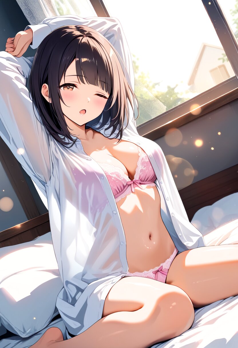1girl, petite, cute, dark black hair, medium hair, straight hair, right diagonal bangs, head tilt, tareme:1.4, beautiful brown eyes, one eye closed, beautiful lips, pink lips, glossy lips, parted lips, open mouth, yawning, sleepy, blush, pink lace bra, pink lace panties, visible through oversized shirt, unbuttoned, medium breasts, cleavage, navel, on bed, wariza, stretching, arms up, dutch angle, morning, morning sun, bedroom, window, see-through lace curtains, pillow, bokeh, Dreamy Blur, light particles,
