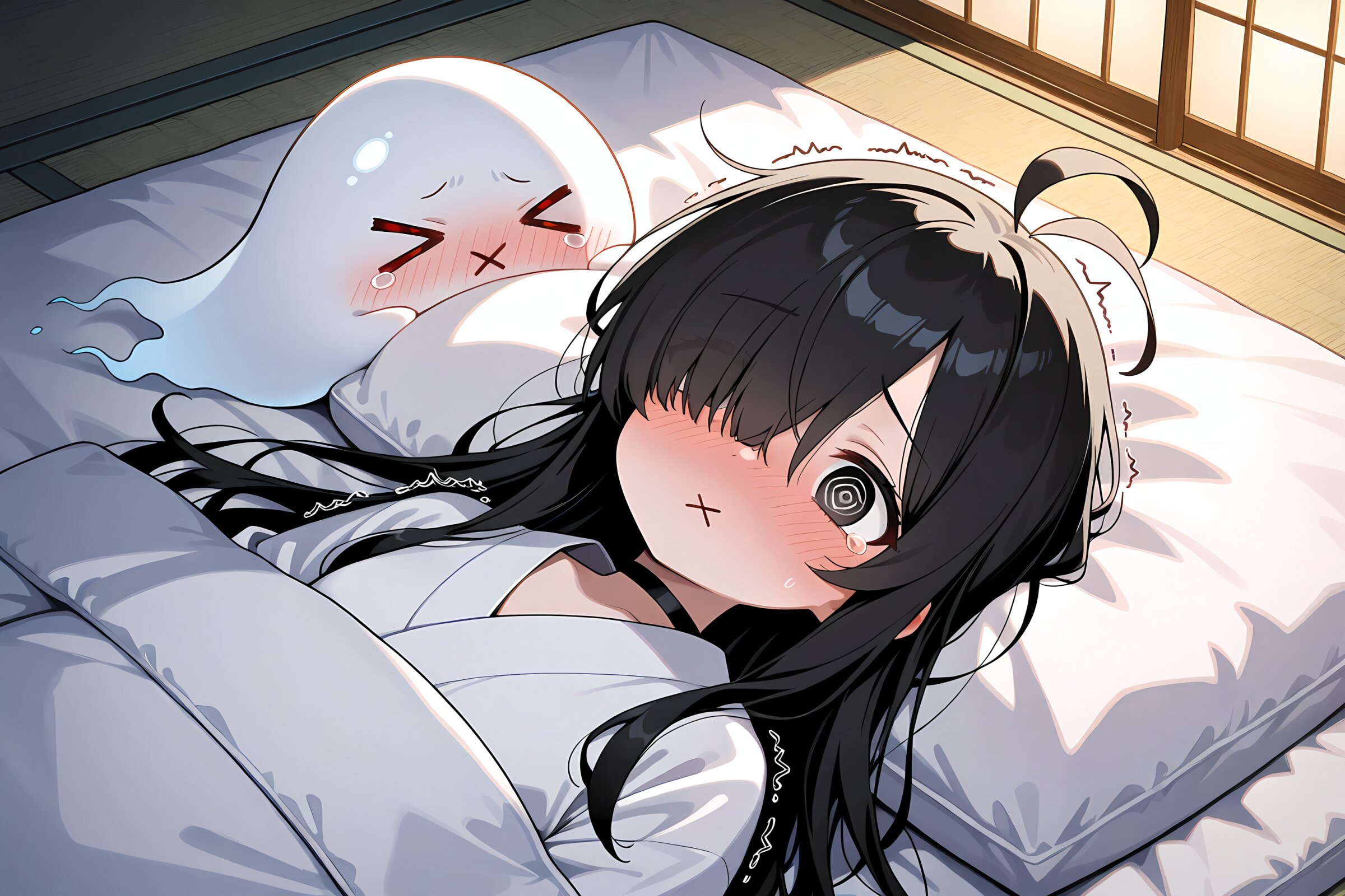 1 little girl, solo, upper body, diagonal angle, masterpiece, best quality, amazing quality, very aesthetic, black hair, long hair, ahoge, (hair over one eye:1.2), black eyes, @_@, (:x:1.2), drunk, troubled, tearful, trembling, blush, choker, white kimono, lying, ghost, >_<, futon, pillow,