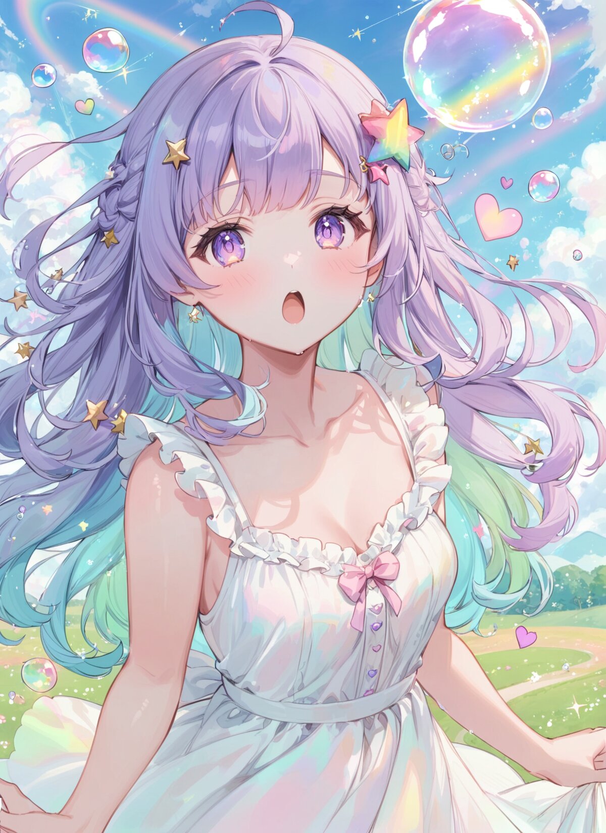 masterpiece, best quality, solo, cute anime girl, pastel color scheme, white summer dress with mint accents, half-up hairstyle, star hair clip, blowing soap bubbles, surprised expression, one soap bubble shaped like a watermelon, floating bubbles with stars and sparkles, dreamy summer field, soft lighting, fluffy clouds, magical atmosphere, rainbow shimmer, pastel color palette, soft glow, sparkles, floating petals, fluffy textures, star motifs, heart motifs, translucent fabric, soft frills, magical atmosphere, gentle light, dreamy background, faint clouds, cute accessories, subtle rainbow tones, masterpiece, best quality, soft pastel color palette, thin delicate lineart, pale colors, watercolor texture, matte finish, subtle shading, minimal contrast,, soft anime face, teenage, pastel purple hair, (light blue inner hair:1.3), fluffy long hair, loosely wavy hair, soft flowing hair, straight-cut bangs, star-shaped hairpin, calm violet eyes,