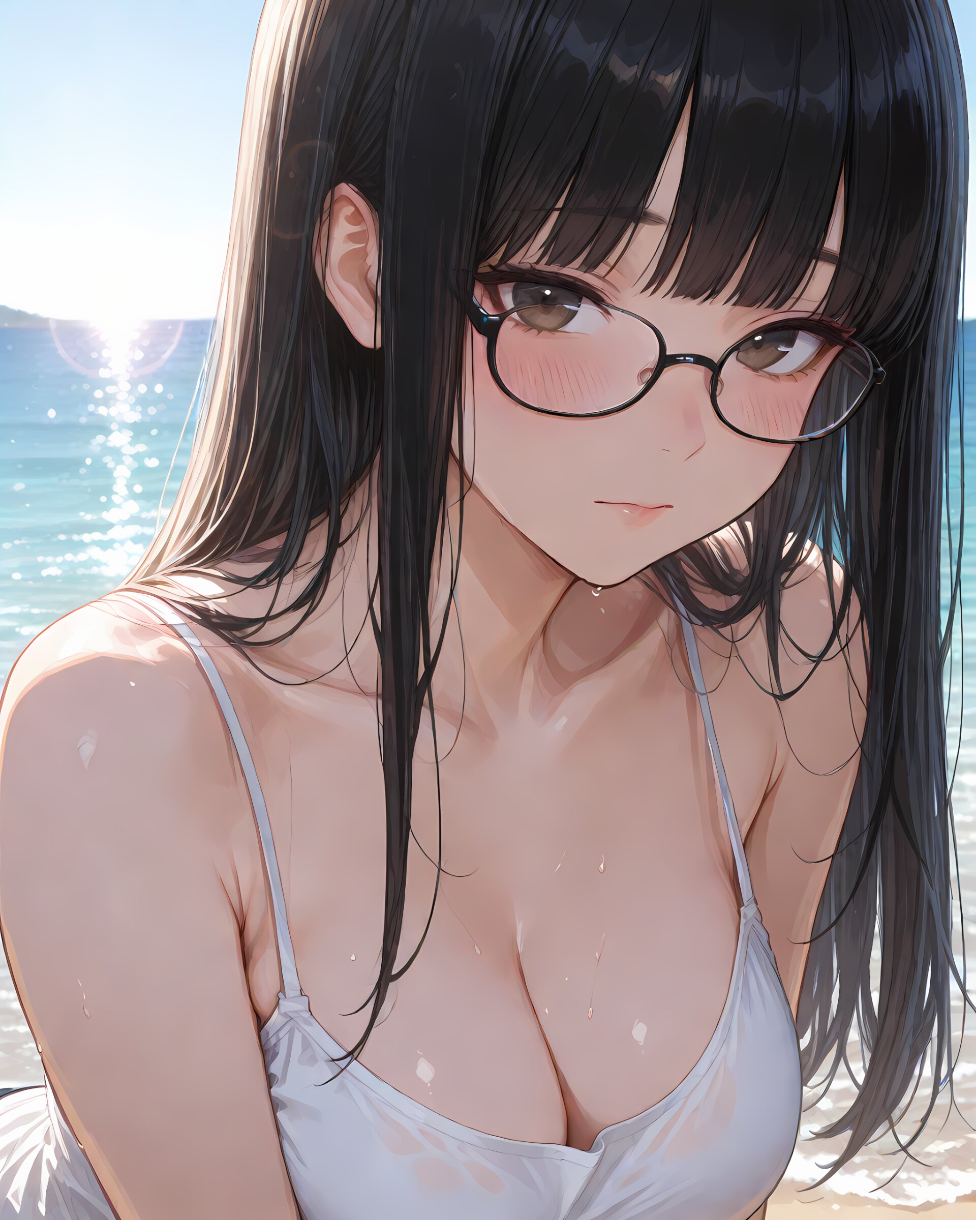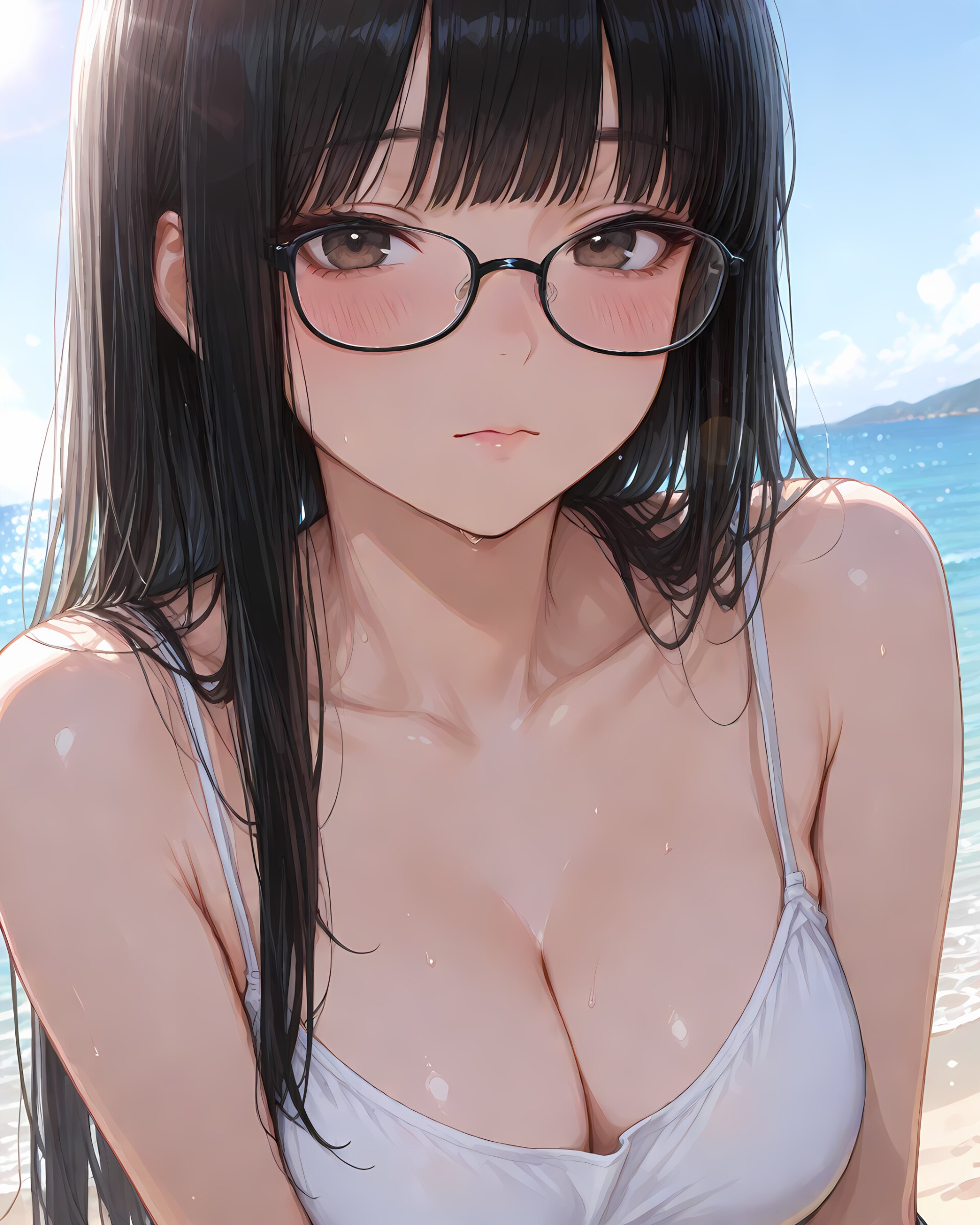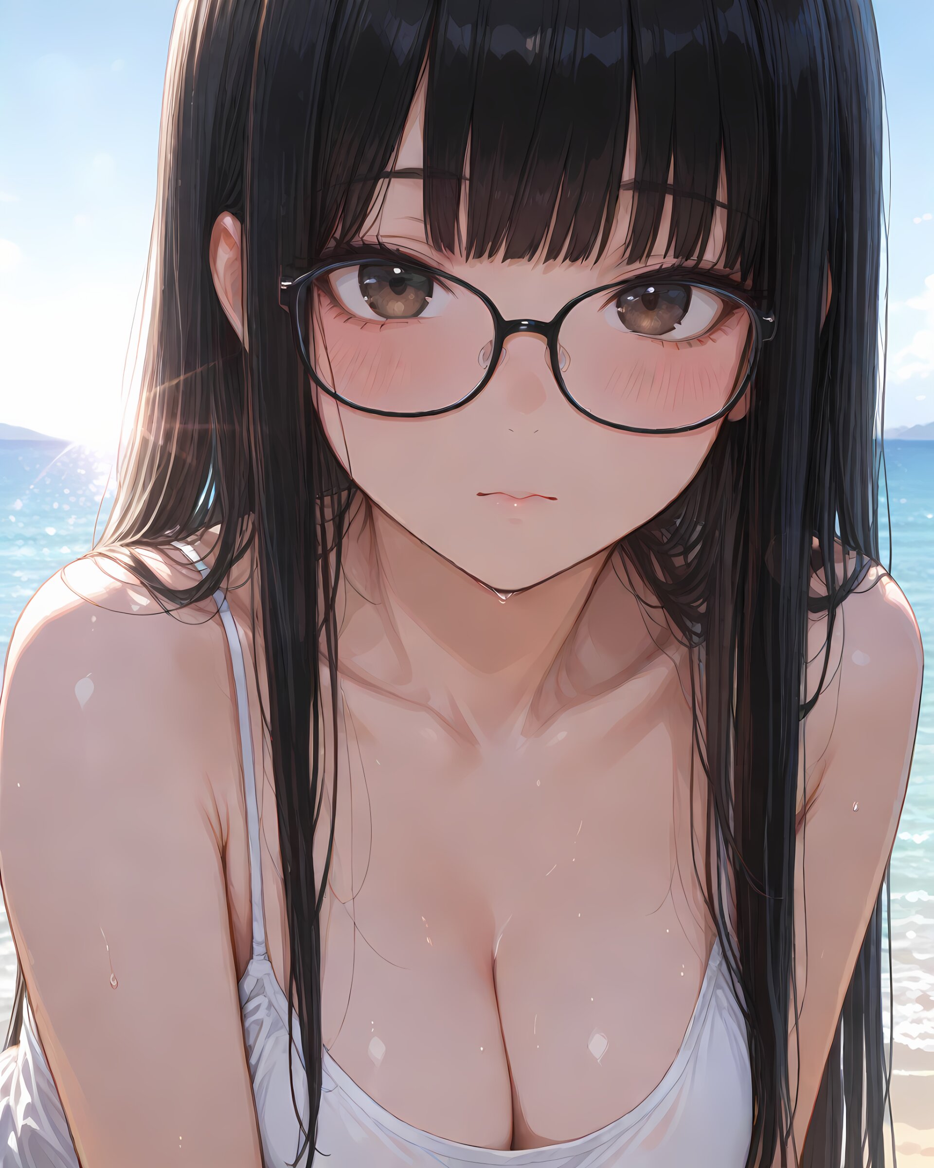 <lora:hyper_sdxl_8_step_lora_f16:1>,, 1girl, seaside, outdoors, day, sun, lens flare, close up, focus face, BREAK 18 years old, girl, long straight black hair, blunt bangs, large breasts, cleavage, collarbone, tank top, spaghetti strap, glasses, blush, BREAK masterpiece, amazing quality, best quality, ultra-detailed, 8K, newest, Japanese,