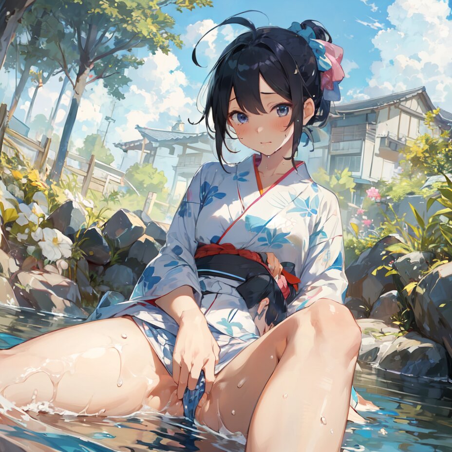 masterpiece, best quality, 1girl, kawaii, pussy, sweat, yukata, Hiding pussy, black hair, Thighs, absolute territory, ponytail, short hair, White scrunchie, rainbow, blue sky, Girls' Front, ahoge, masturbation, Soak feet in the stream,