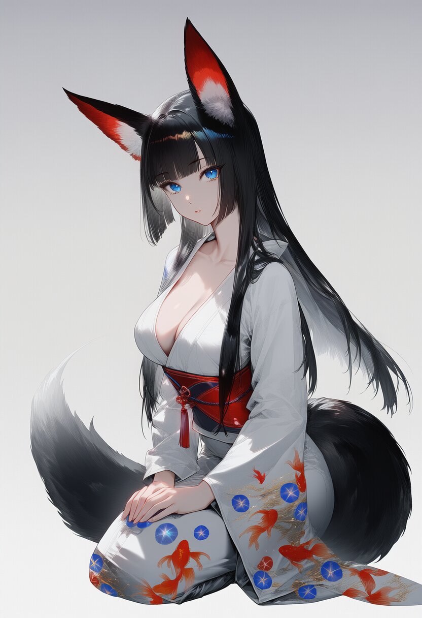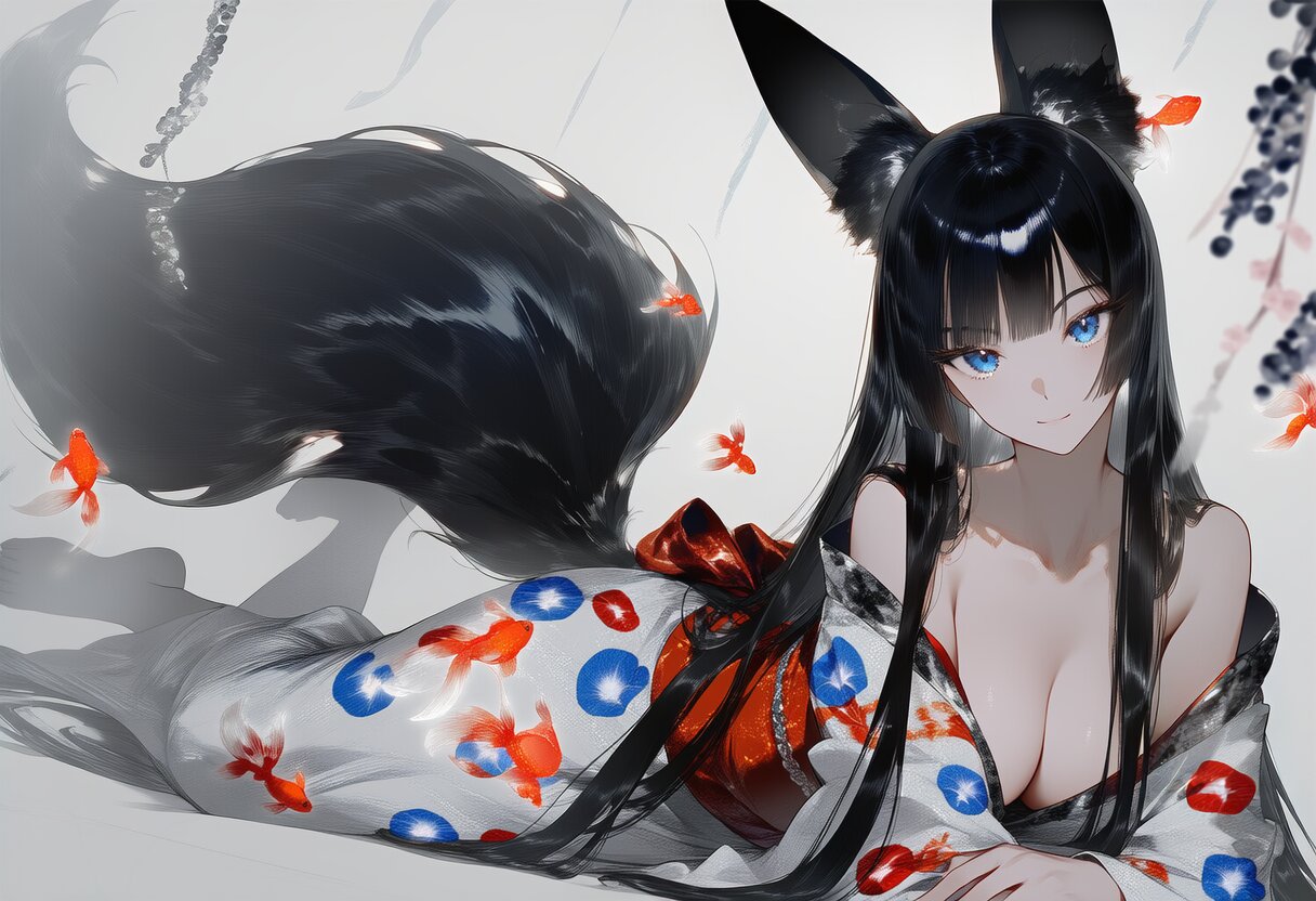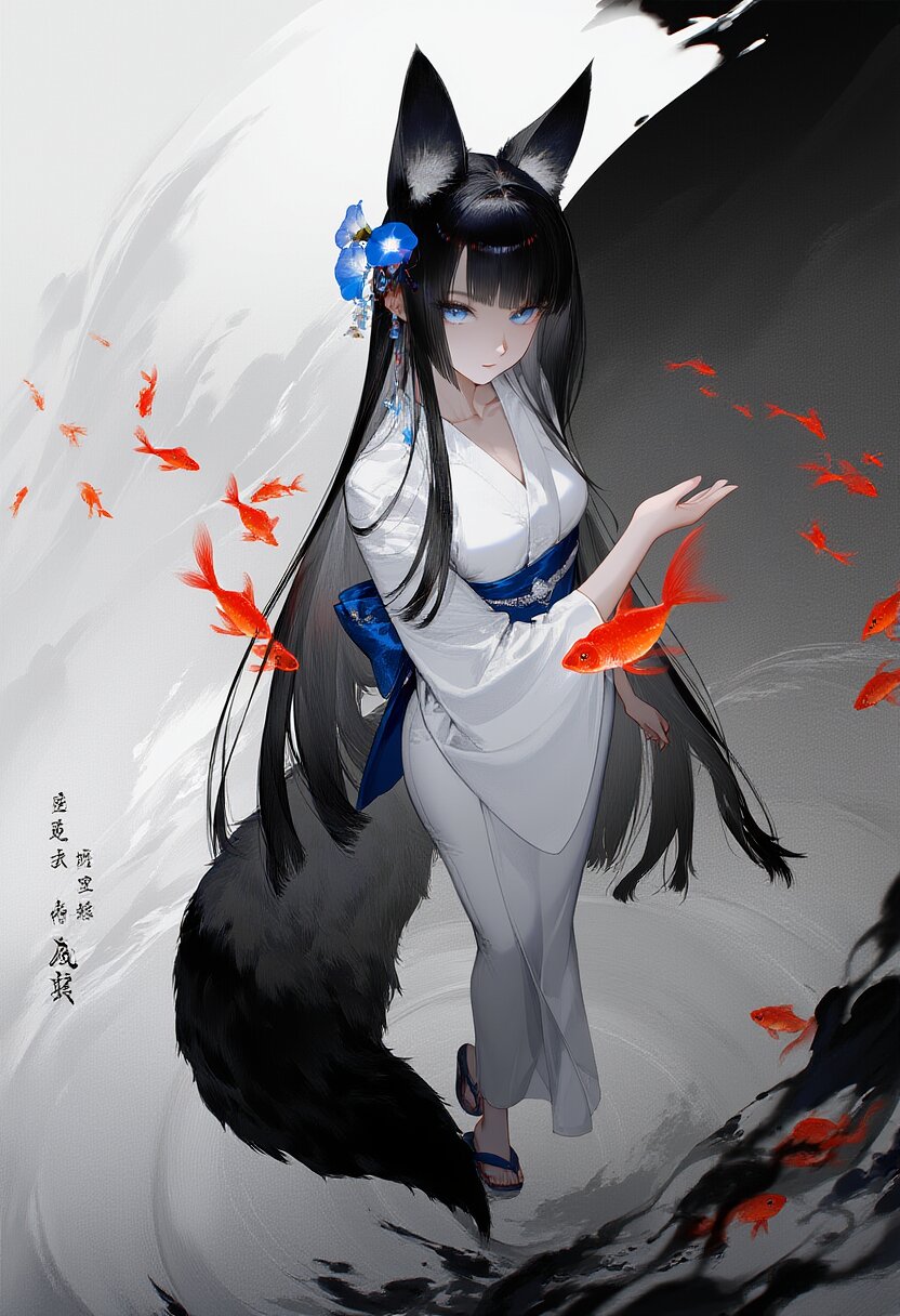{{{very aesthetic geme cg}}}, {{{amazing quality}}}, {{{ultra detailed}}}, {{{masterpiece}}}, {{{best quality}}}, {{{high resolution}}}, {{{detaild intricate}}}, {{{absurdres}}}, {{{masterpiece}}}, {{{high quality}}}, {{{very aesthetic}}}, {{{beautiful}}}, dutch angle, perfect anatomy, beautiful detailed glow, 1girl, fox girl, fox ears, black fox tail, very aesthetic shiny clear blue eyes, silky smooth skin, very aesthetic silky smooth metallic hair, collarbone, black long hair, straight hair, hime cut, eyelashes, lipgloss, cool, very aesthetic yukata, depth of field, art, sumi-e, ukiyo-e, spot color, goldfish, colorful morning glory, full body, metallic, metal, come hither,